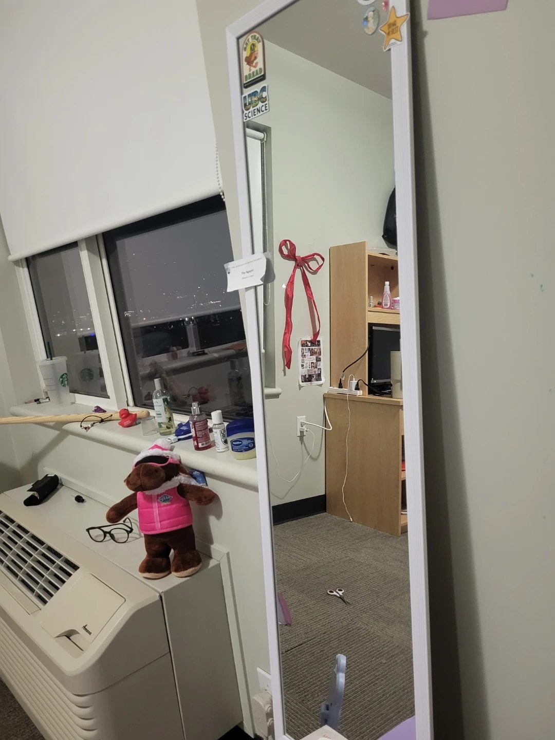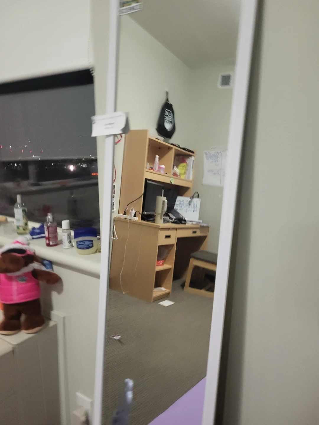 A full-length mirror with a white frame. It's perfect for checking your outfit before heading out. The frame is sturdy and designed for long-term use. The sticker can be take out. Pick up in April 22