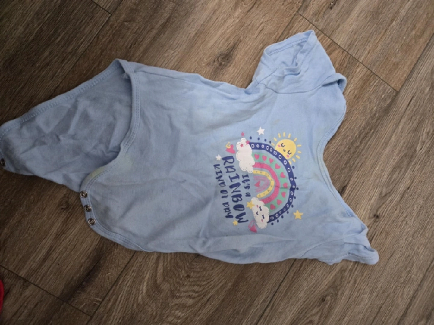 This adorable baby blue onesie features a cute rainbow design that says "It's a Rainbow Kind of Day"! It's perfect for keeping your little one comfy and stylish. There are some signs of use.