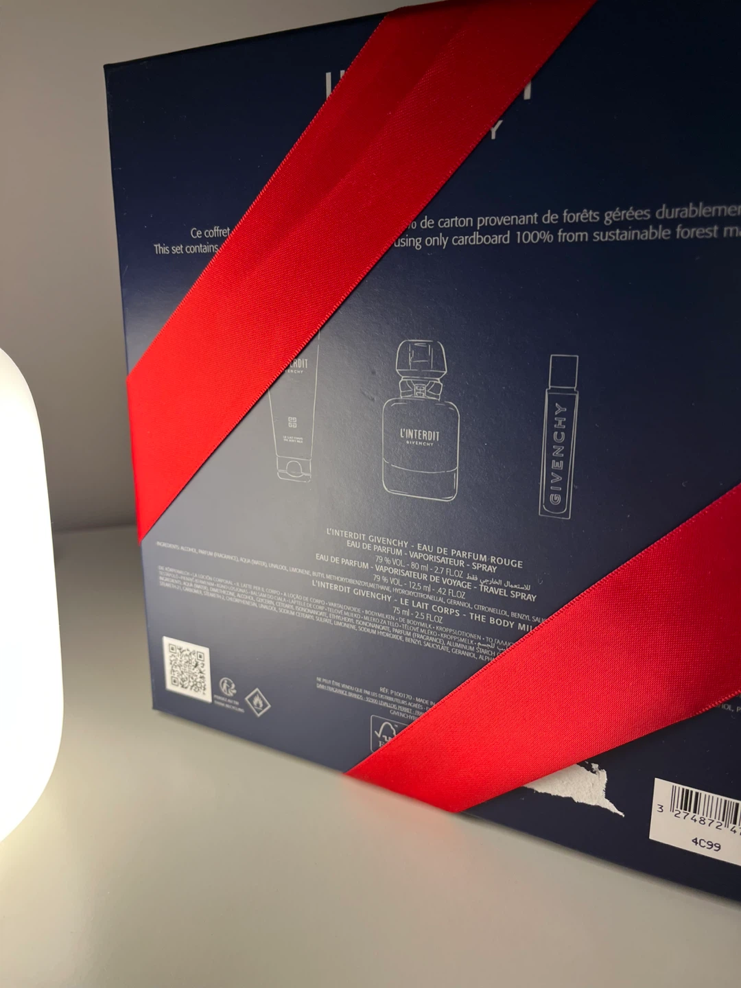 Selling a Givenchy L'Interdit gift set! The set includes L'Interdit Eau de Parfum Rouge, L'Interdit Eau de Parfum (travel size), and L'Interdit The Body Milk. This set contains items for a complete fragrance experience