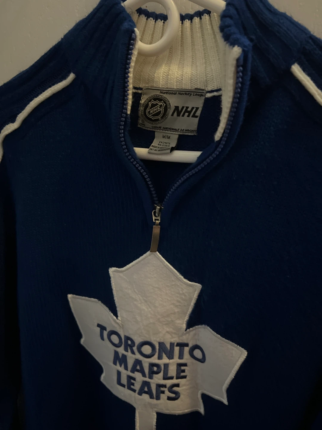 Selling a Toronto Maple Leafs NHL sweater in size M/M. It's a cozy knit with the classic Leafs logo on the front and the NHL logo on the sleeve. Perfect for showing your team spirit!