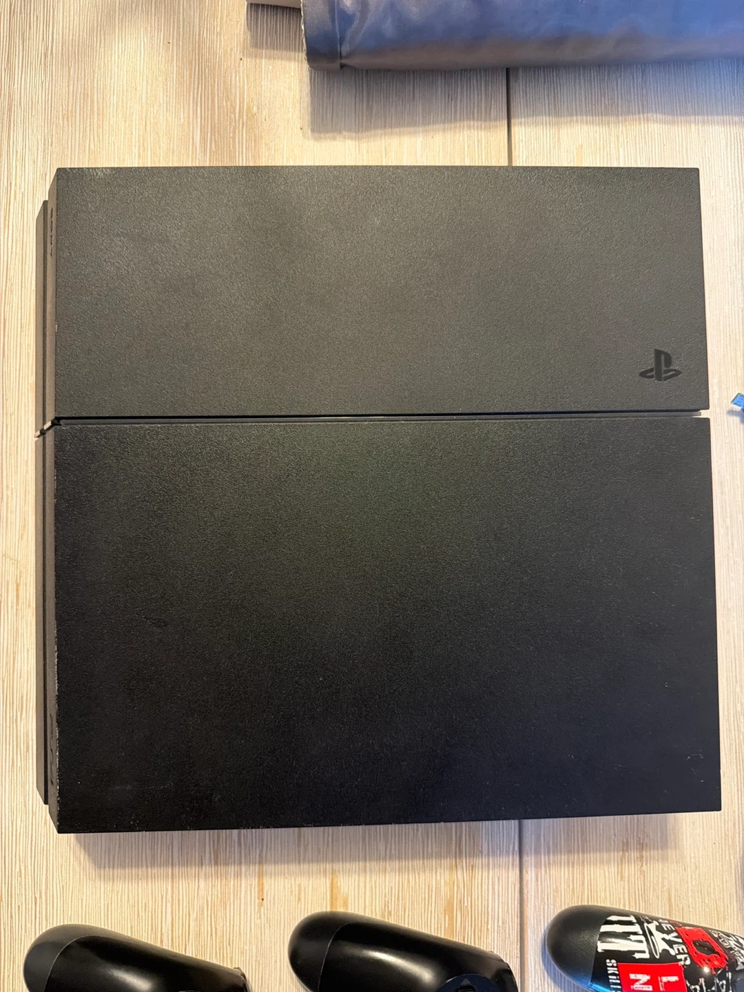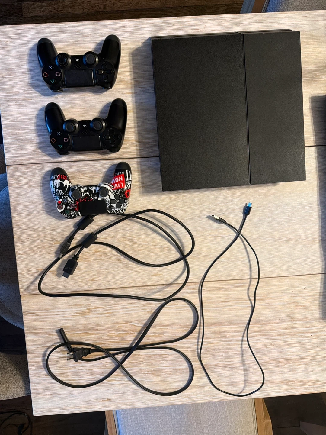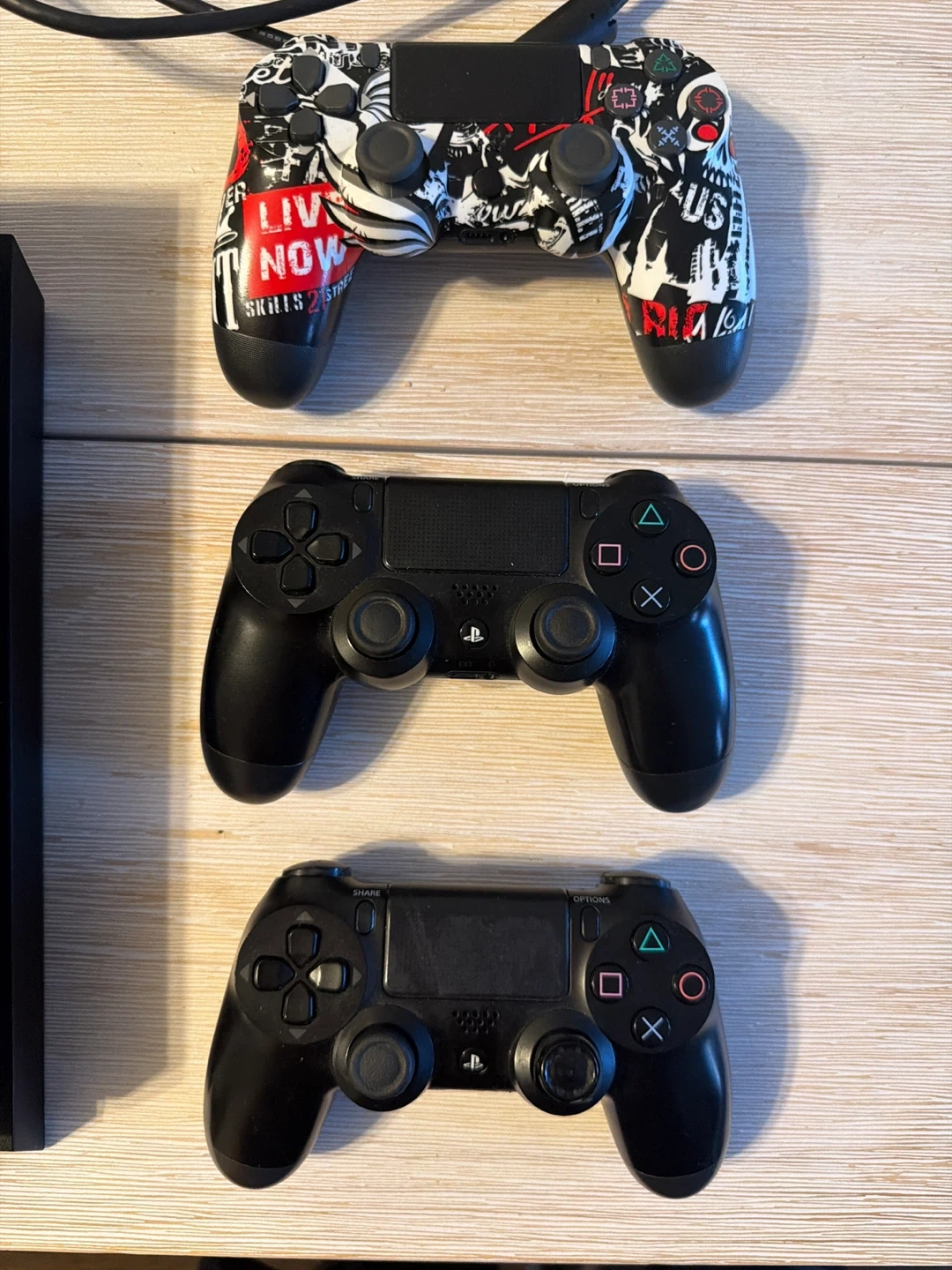 This is a black Sony PlayStation 4 console. It comes with three controllers and necessary cables. One controller has a unique graphic design, while the other two are standard black.