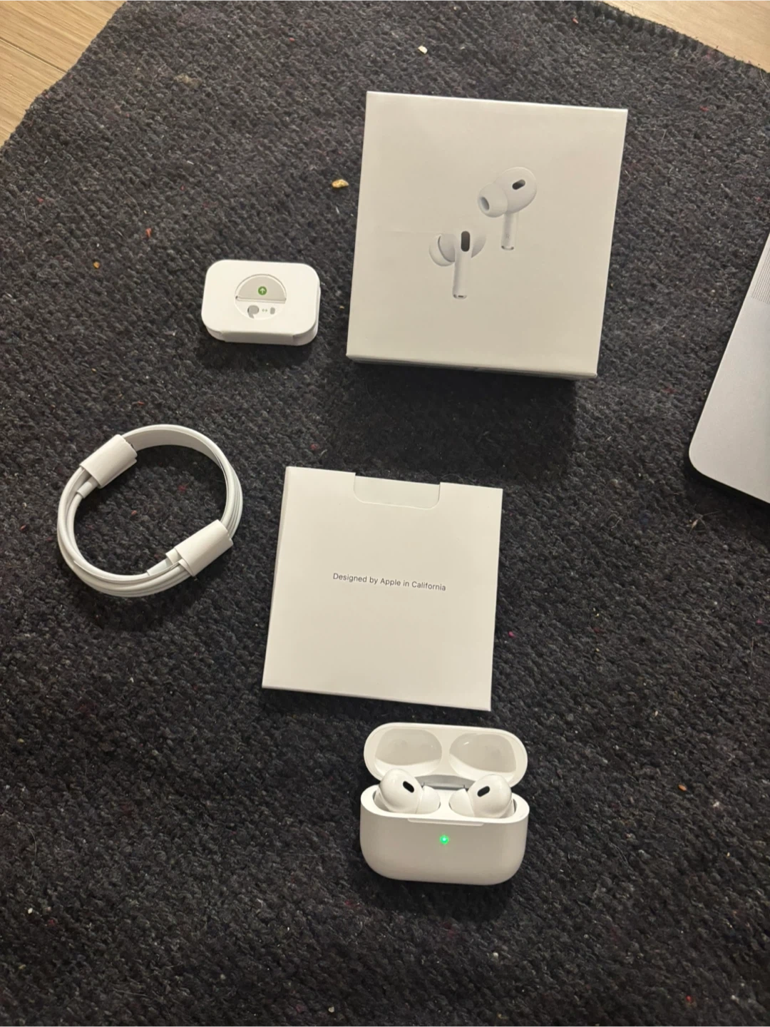 Apple AirPods Pro (2nd generation) wireless earbuds. Includes charging case, USB-C charging cable, and original packaging. Designed by Apple in California.