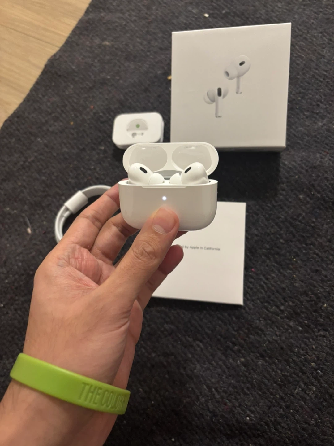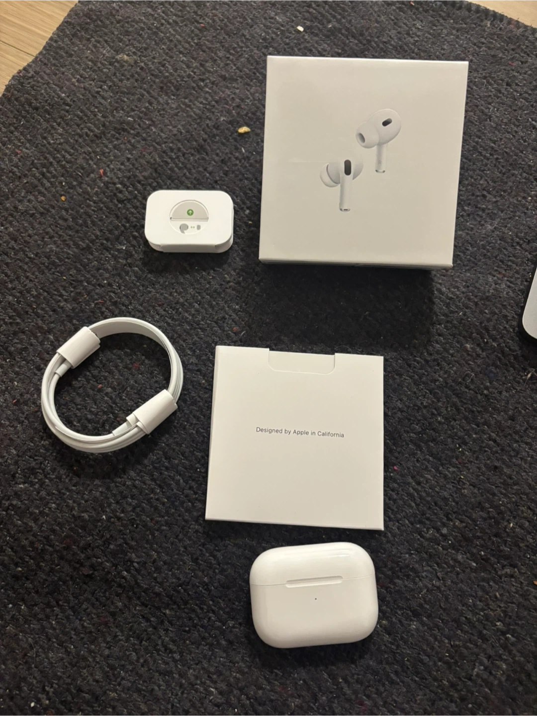 Apple AirPods Pro (2nd generation) wireless earbuds. Includes charging case, USB-C charging cable, and original packaging. Designed by Apple in California.