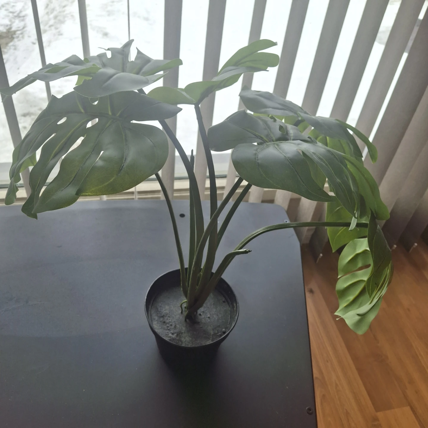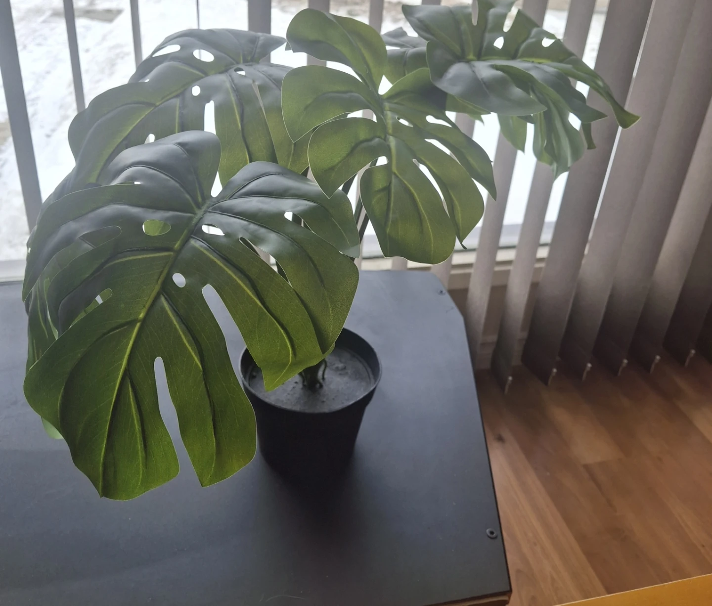 Realistic-looking artificial monstera plant in a black pot