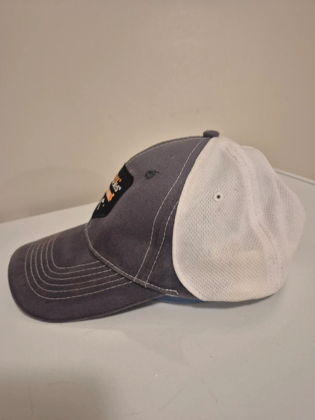 Grey and white baseball cap with Stihl Timbersports logo on the front and a Canadian flag on the back. Mesh back for breathability. Adjustable strap.