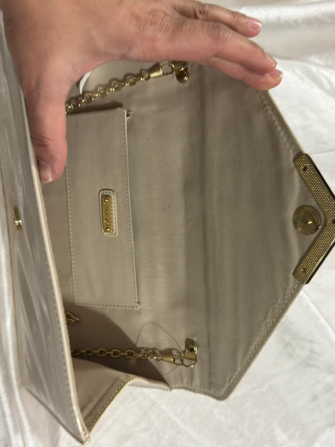 Selling a cute Aldo clutch purse in a beige colour! It has a gold-tone accent on the front and a chain strap inside. Perfect for evenings out or special occasions
