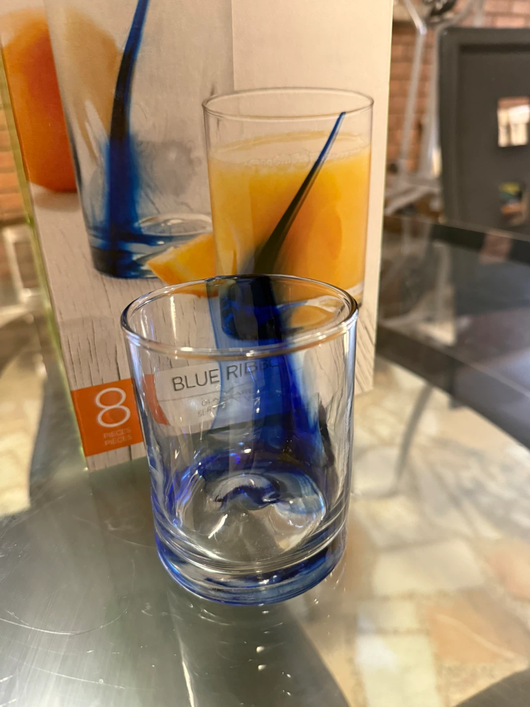 This is a set of 8 Libbey Blue Ribbon glassware pieces. The glasses feature a blue ribbon design. They are made of glass.