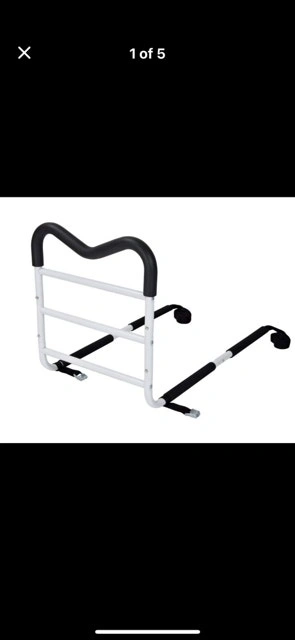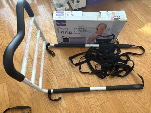 Contoured Bed Rails by MedPro are designed to help you remain safe in bed and independent in your home. This bed safety rail has a unique M shape that allows for multiple gripping positions and the easy to assemble, compact design makes it ideal for travel. The MGrip's foam contoured handle allows you to comfortably reposition in bed, safely transfer in or out of bed and helps keep you safely in bed. MGrip's Bed Rail For Seniors has 2 height settings with crossbars that help prevent entrapment and the adjustable strap with durable steel buckles, adapt to fit all mattress formats. Weight capacity of 300 lb. / 136.1 kg. Condition: Used - Like new. For Sale By: Owner.