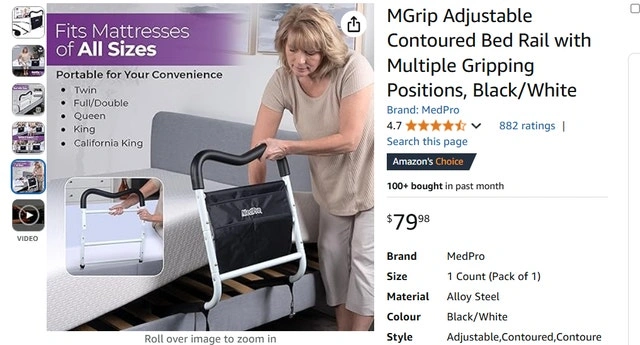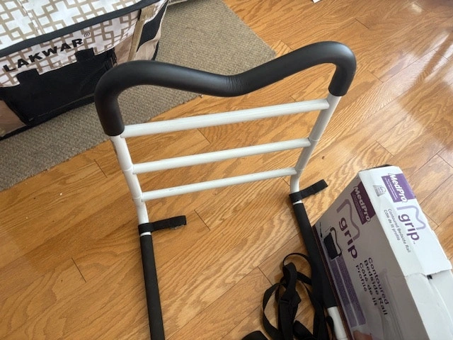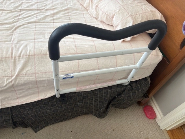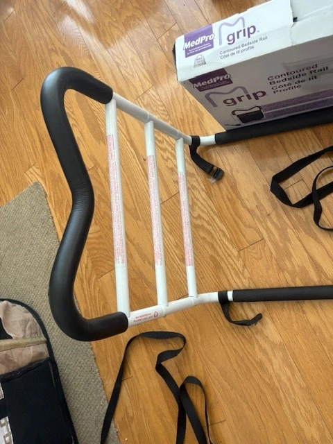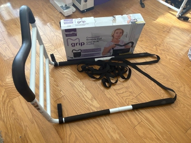 Contoured Bed Rails by MedPro are designed to help you remain safe in bed and independent in your home. This bed safety rail has a unique M shape that allows for multiple gripping positions and the easy to assemble, compact design makes it ideal for travel. The MGrip's foam contoured handle allows you to comfortably reposition in bed, safely transfer in or out of bed and helps keep you safely in bed. MGrip's Bed Rail For Seniors has 2 height settings with crossbars that help prevent entrapment and the adjustable strap with durable steel buckles, adapt to fit all mattress formats. Weight capacity of 300 lb. / 136.1 kg. Condition: Used - Like new. For Sale By: Owner.