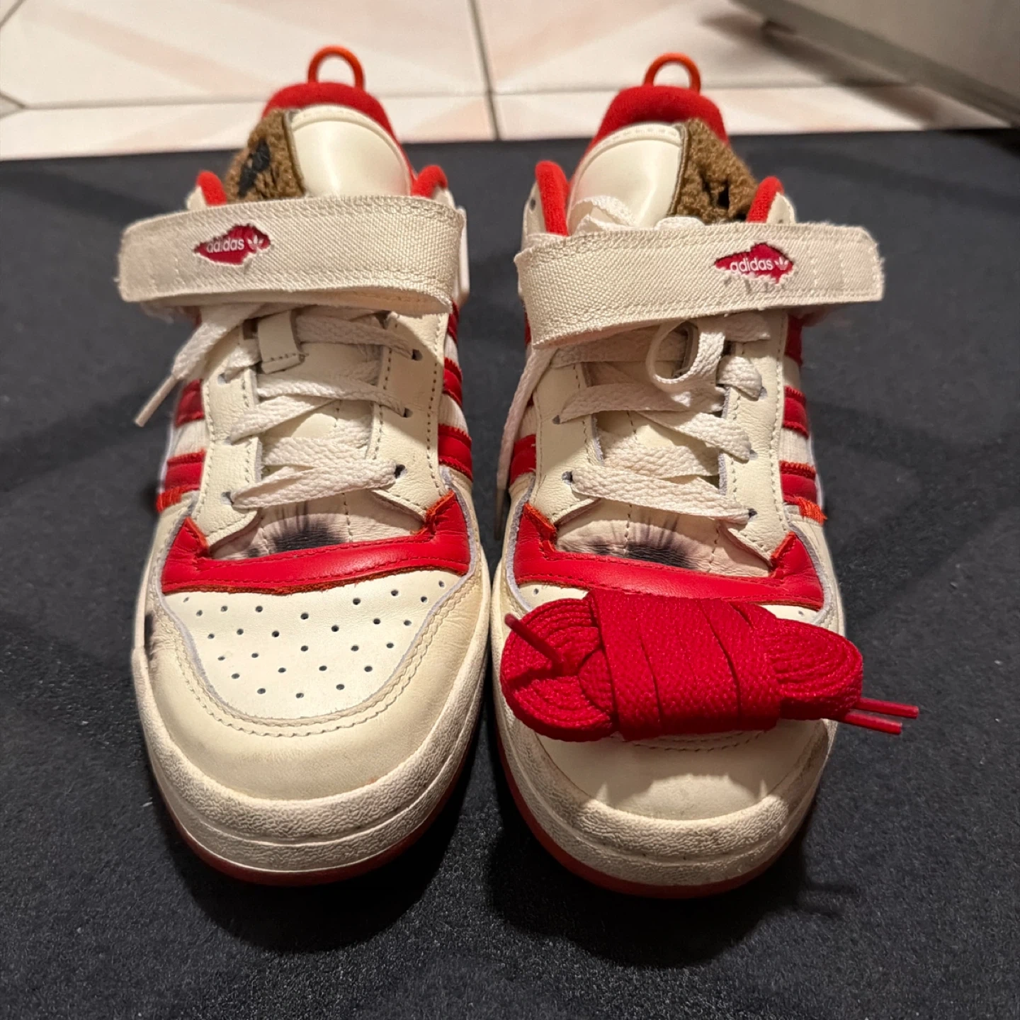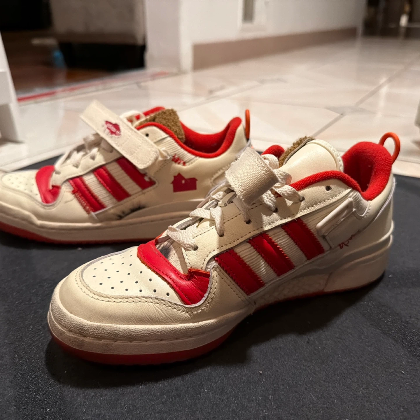 These Adidas Forum Low sneakers are a collaboration with "Home Alone". They feature a cream and red colorway with distinctive "M" logos on the heel. The shoes are size 6 US Women's and come with extra red laces.