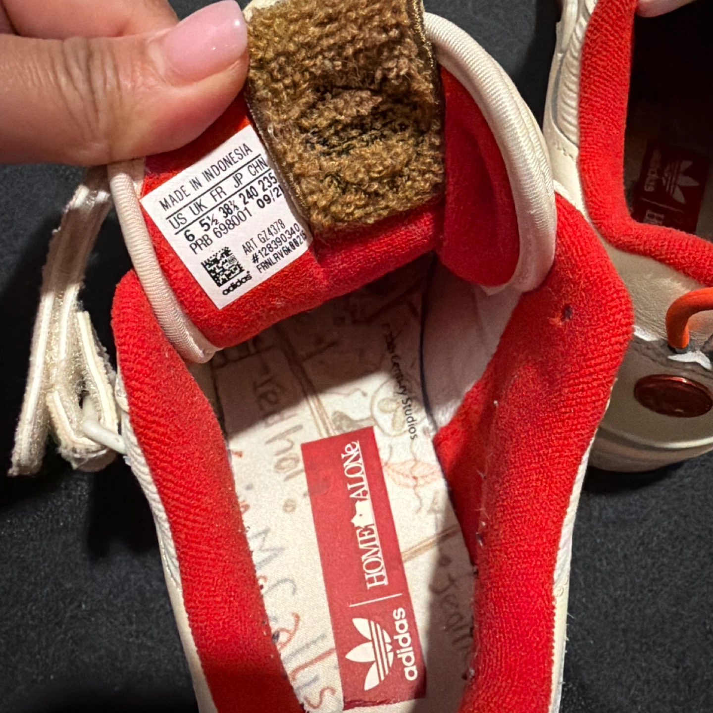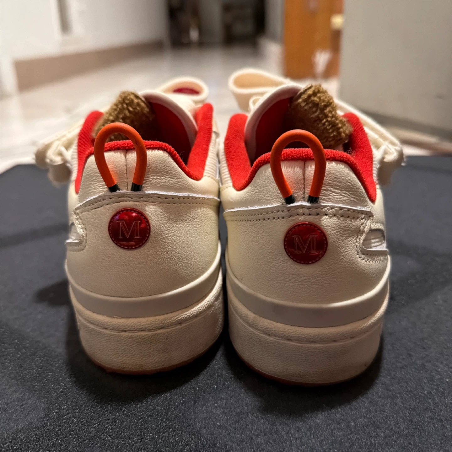 These Adidas Forum Low sneakers are a collaboration with "Home Alone". They feature a cream and red colorway with distinctive "M" logos on the heel. The shoes are size 6 US Women's and come with extra red laces.