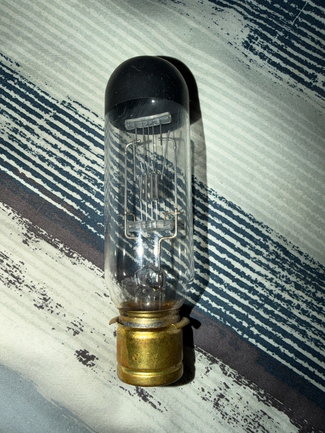 This is a vintage incandescent light bulb with a clear glass casing and a black top. It has a brass-coloured screw base. It's a classic bulb that could be used for decorative lighting or vintage restoration projects.