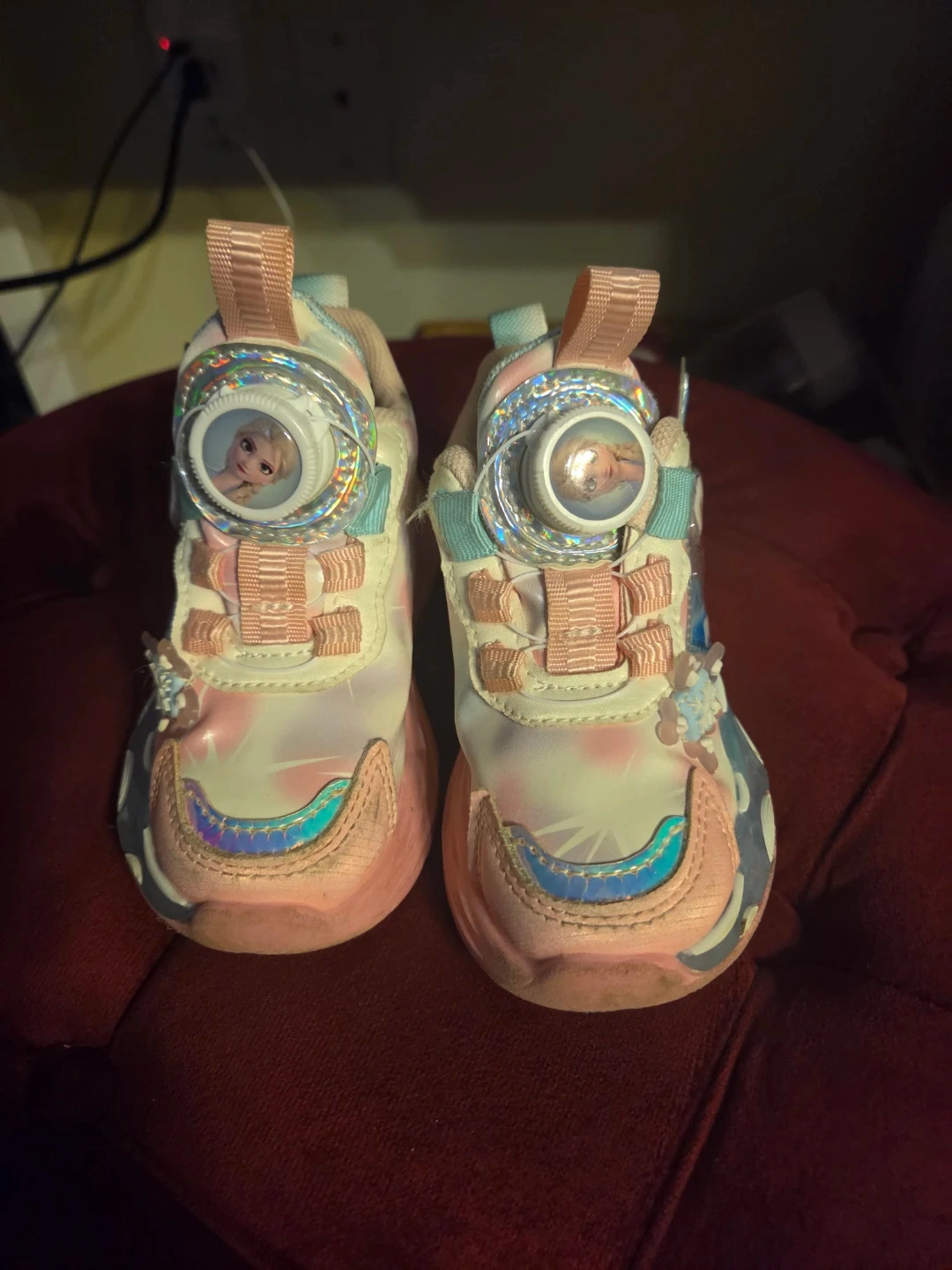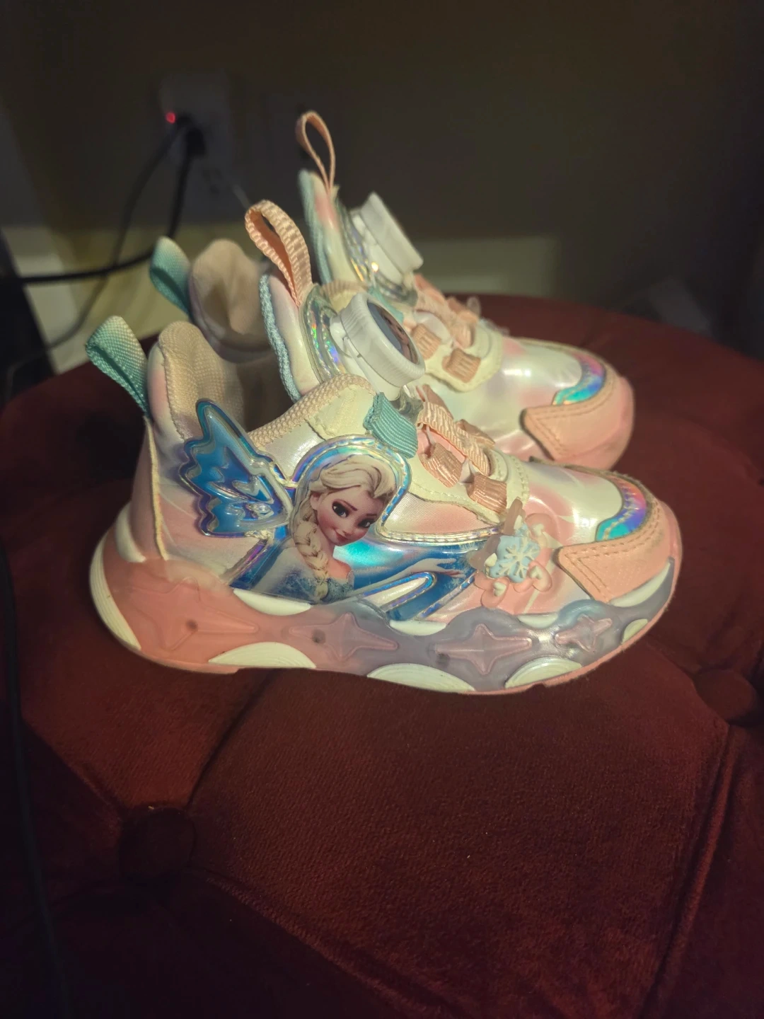 These cute pink and white sneakers feature a Disney Frozen theme with Elsa on the sides. They have a dial closure for easy tightening. The soles show a size 22 indication, suggesting a small children's size. Perfect for any little Frozen fan!