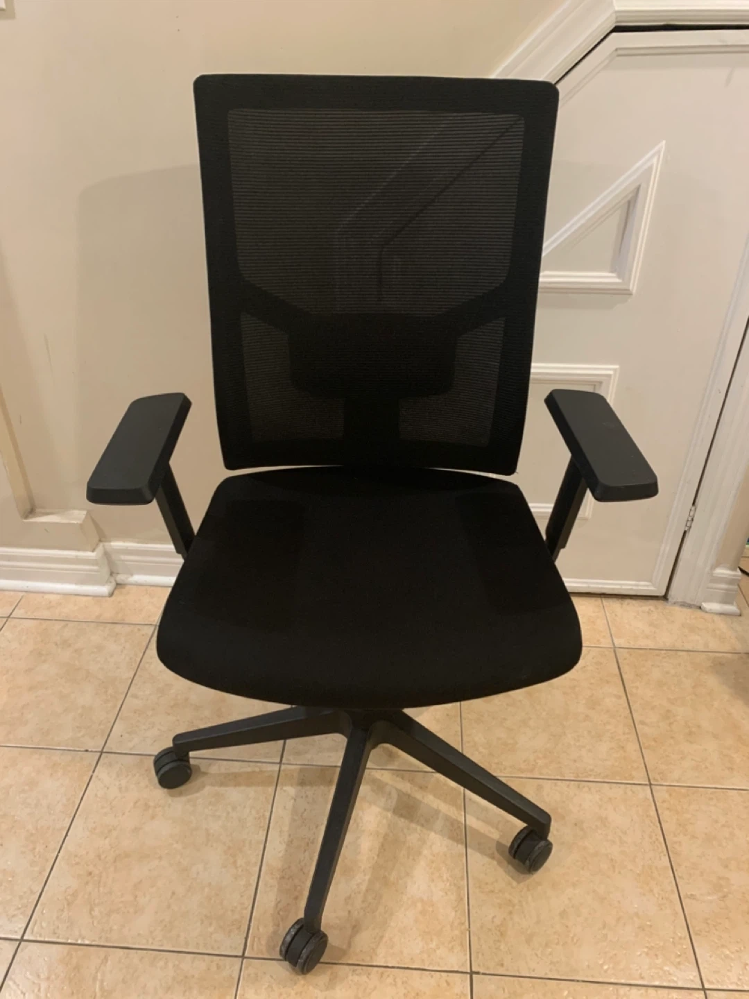 Selling a black office chair. It's in gently used condition with some wear and scuffs. Please see photos for details.
