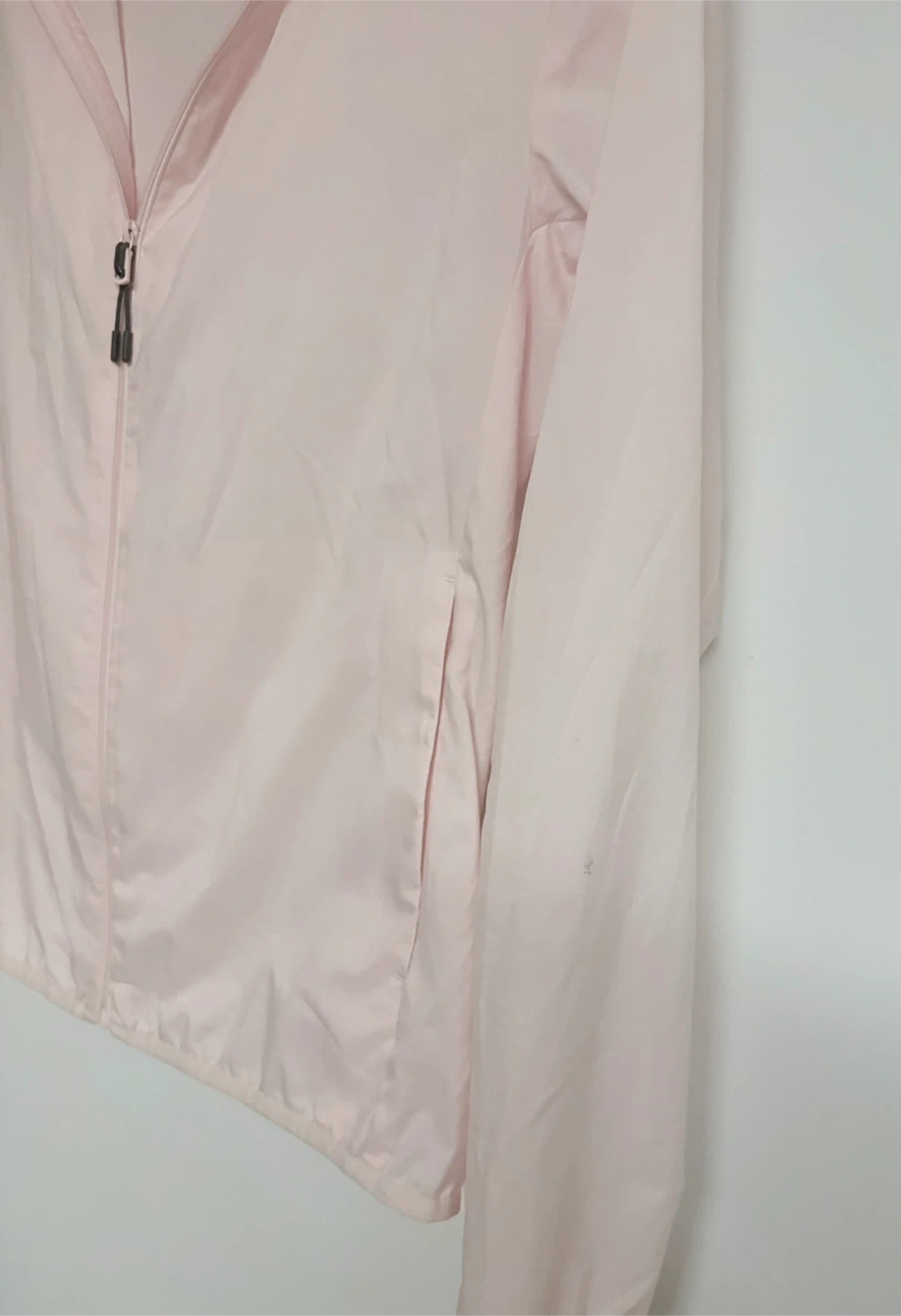 This is a UNIQLO lightweight hooded jacket in a pale pink colour.