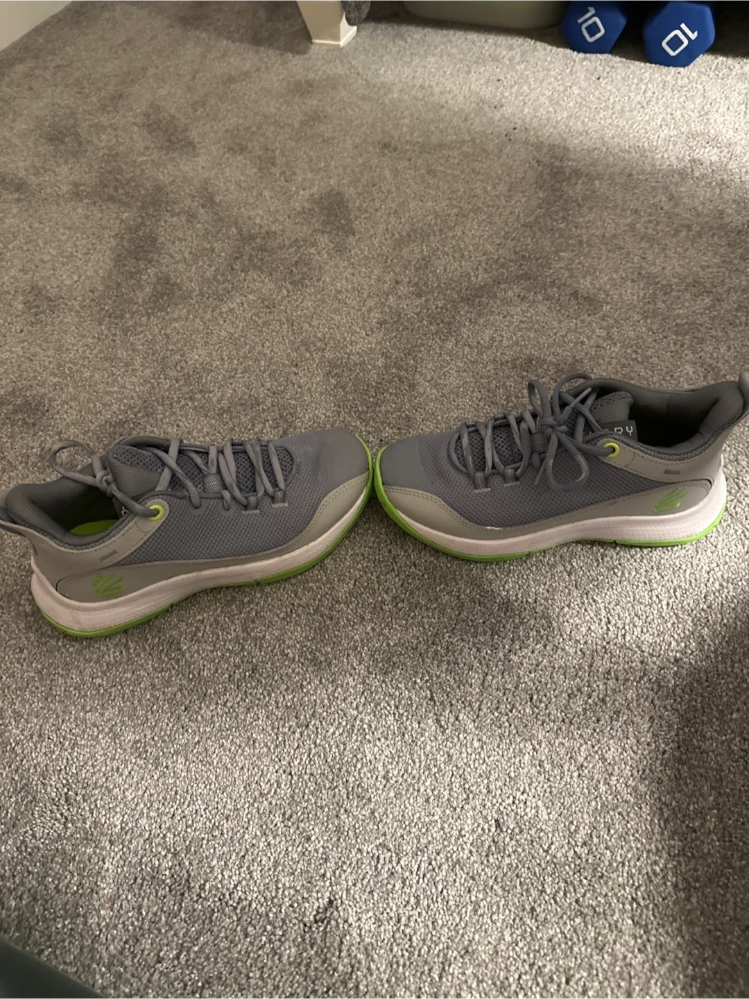 These are Under Armour basketball shoes in grey and lime green. They're designed for performance on the court. Good traction on the sole.