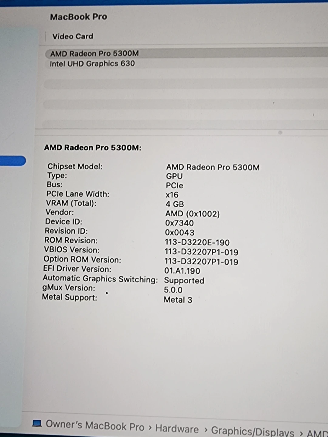 This 2019 MacBook Pro has a 2.6 GHz 6-Core Intel Core i7 processor. It features 16 GB of 2667 MHz DDR4 memory and a 500.28 GB Apple SSD. Graphics include Intel UHD Graphics 630 and AMD Radeon Pro 5300M with 4 GB VRAM.