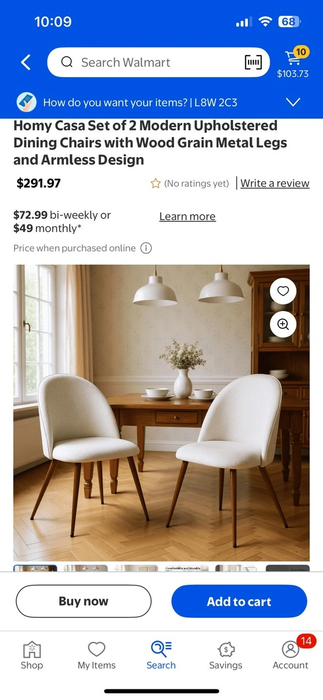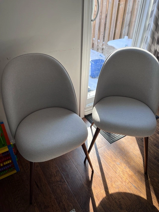 Set of two Homy Casa modern upholstered dining chairs with wood grain metal legs. These armless chairs are in good used condition and would look great in your home. If the ad is up, the chairs are available! Cash accepted.