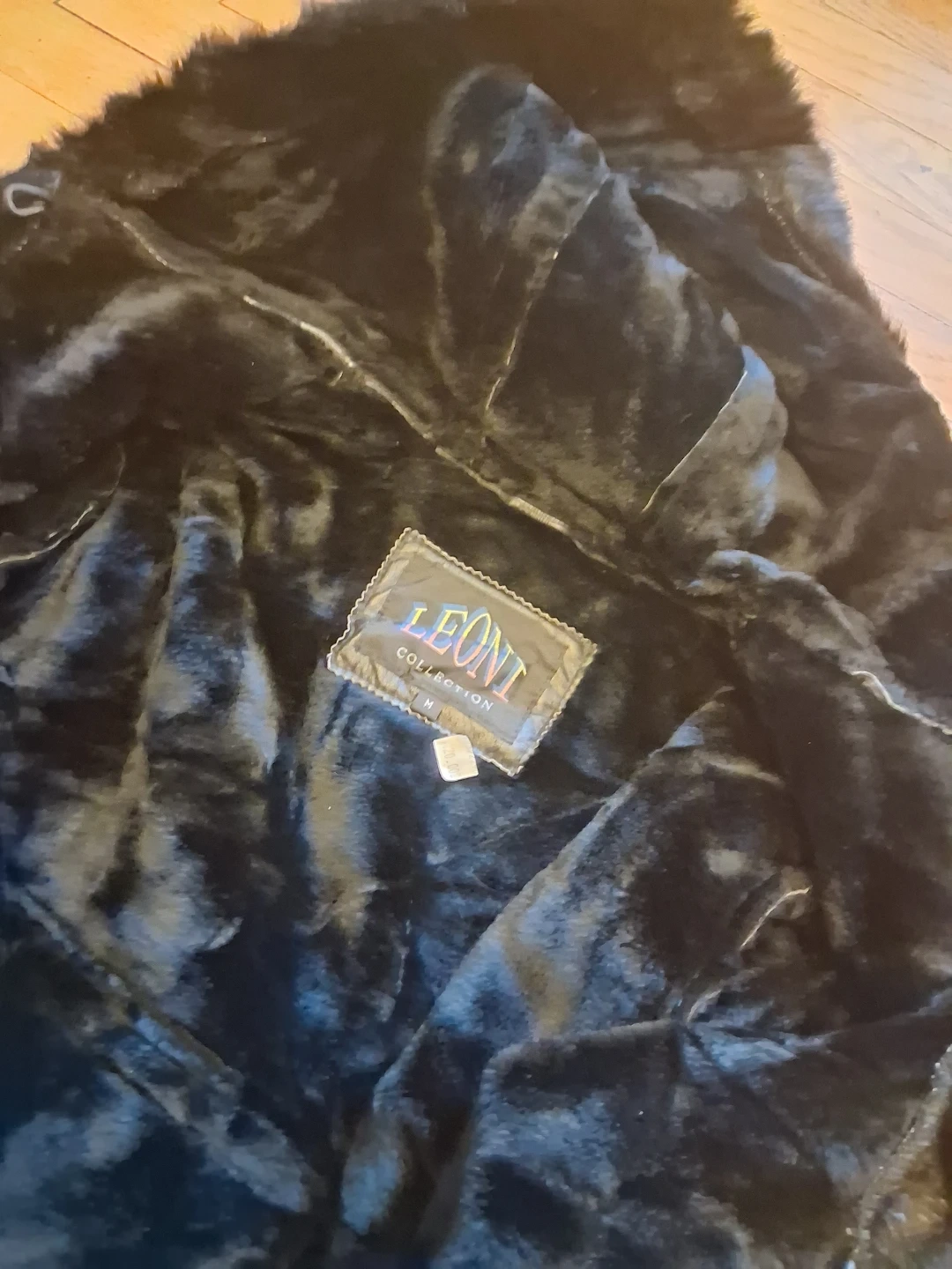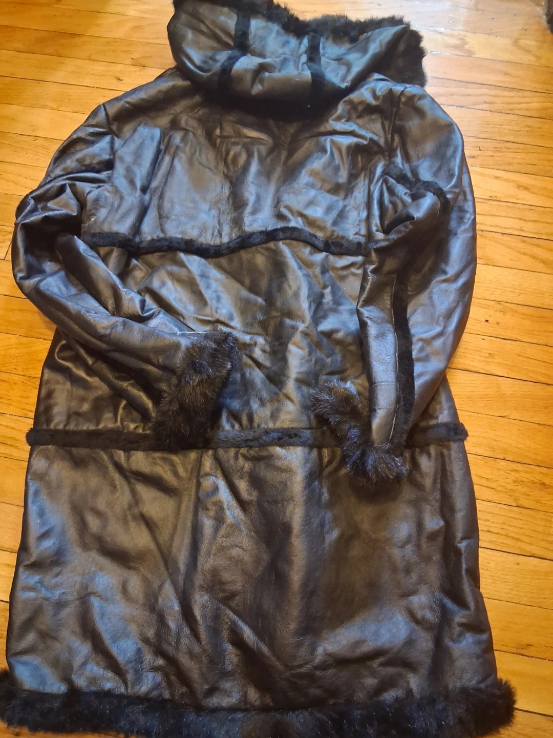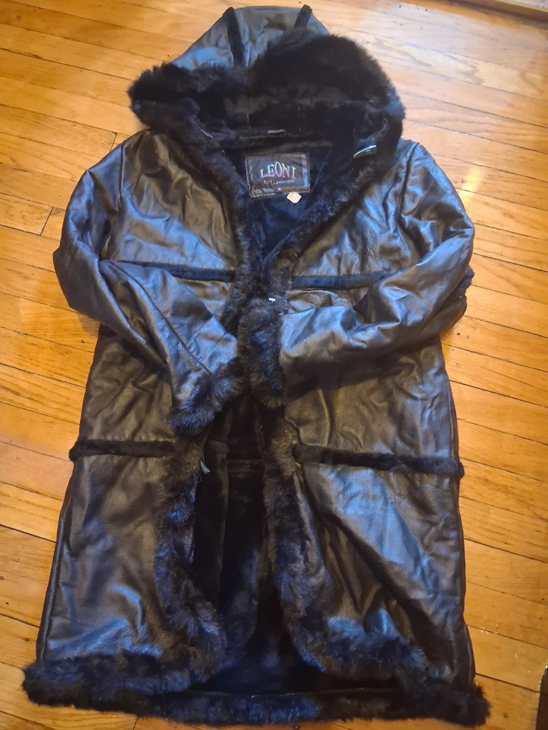 This black Leoni Collection coat features a faux leather exterior and a plush fur lining. It has a hood and a stylish long silhouette. Size is medium.
