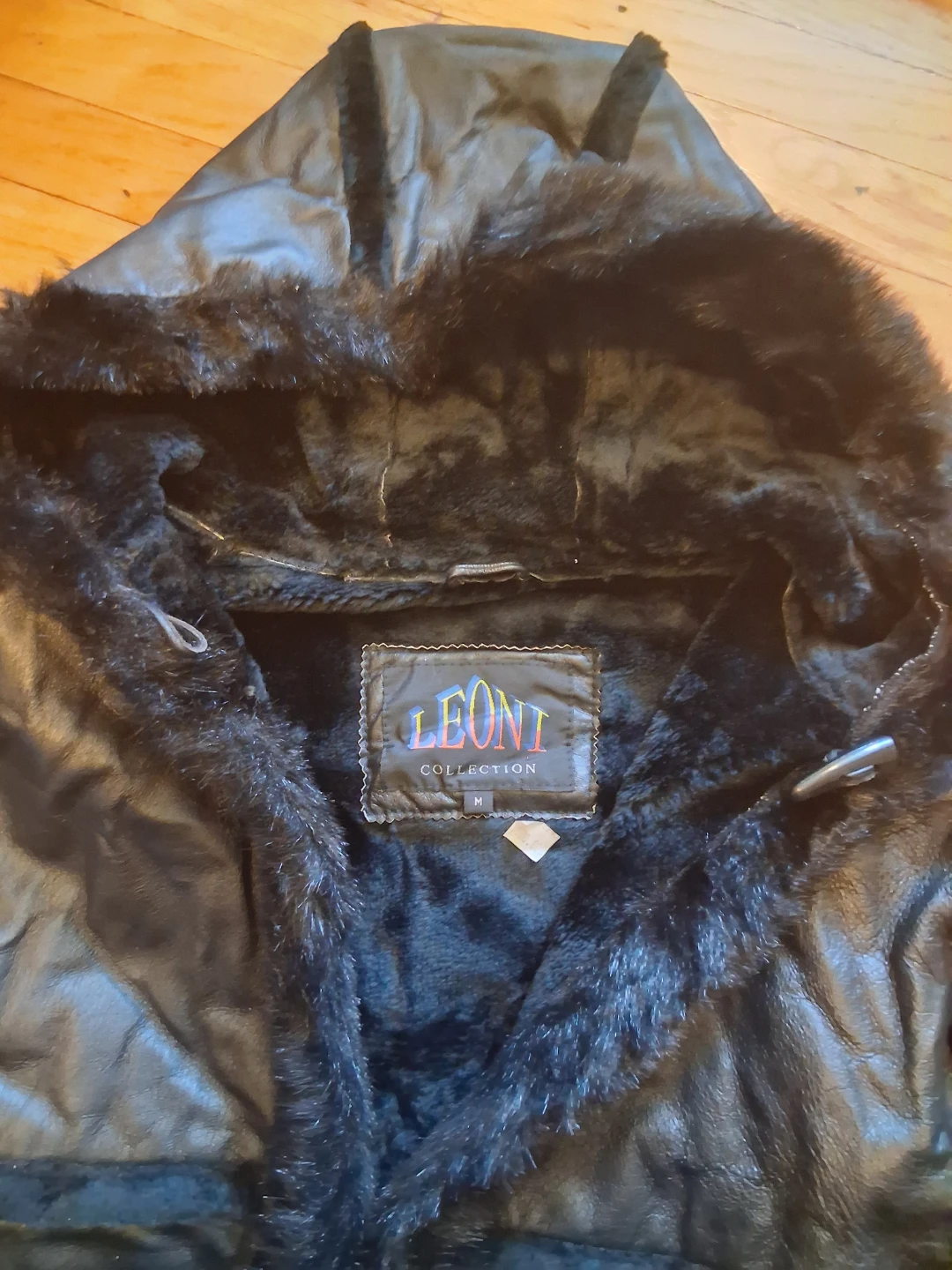 This black Leoni Collection coat features a faux leather exterior and a plush fur lining. It has a hood and a stylish long silhouette. Size is medium.