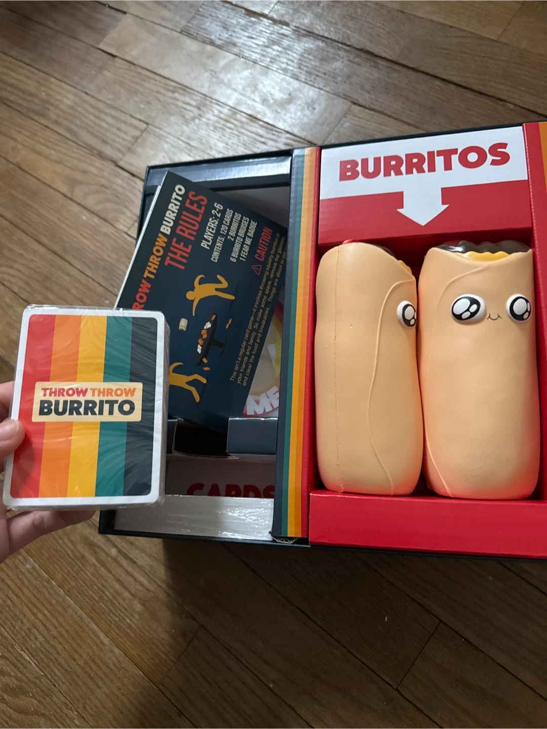 Brand new, sealed cards. “Throw Burrito card game, a hilarious dodgeball card game. It's made by Exploding Kittens. Suitable for ages 7 and up, it's great for parties and family game nights!”