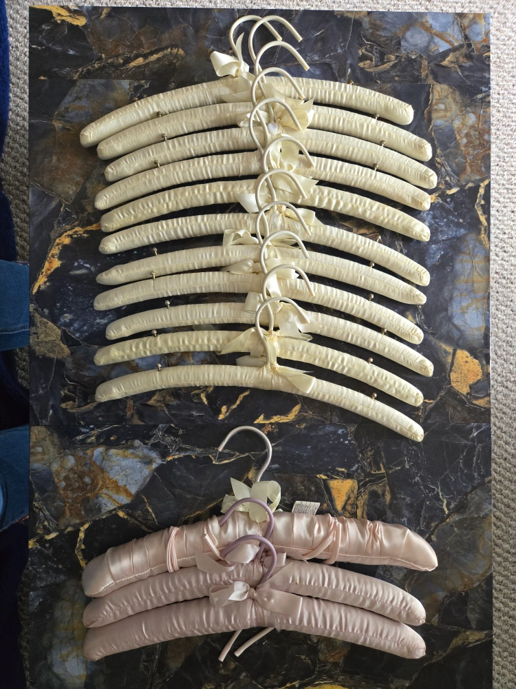 Selling a set of 14 padded clothes hangers. There are 11 in cream and 3 in light pink. They are perfect for delicate items!