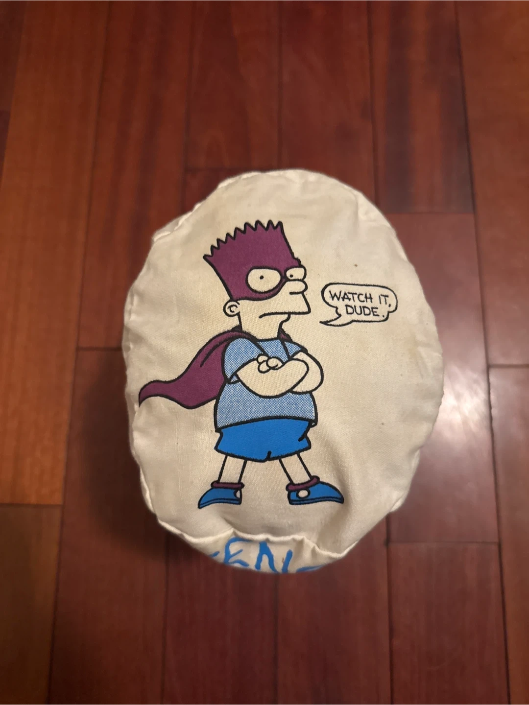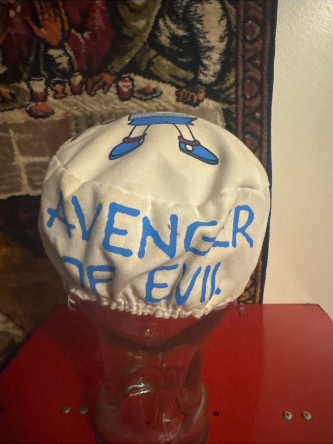 This is a Bartman visor hat featuring Bart Simpson as a superhero. The hat is white with a blue visor and has the "AVENGER OF EVIL" text printed on the front. It also has "WATCH IT, DUDE." speech bubble. Made of cloth material.