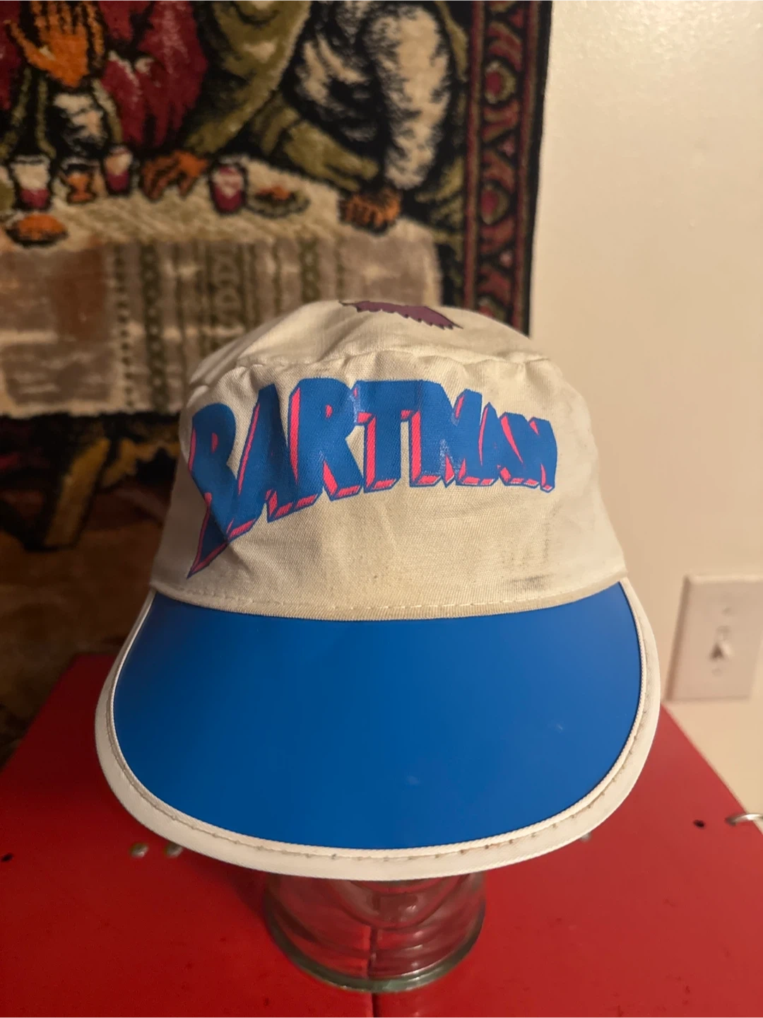 This is a Bartman visor hat featuring Bart Simpson as a superhero. The hat is white with a blue visor and has the "AVENGER OF EVIL" text printed on the front. It also has "WATCH IT, DUDE." speech bubble. Made of cloth material.