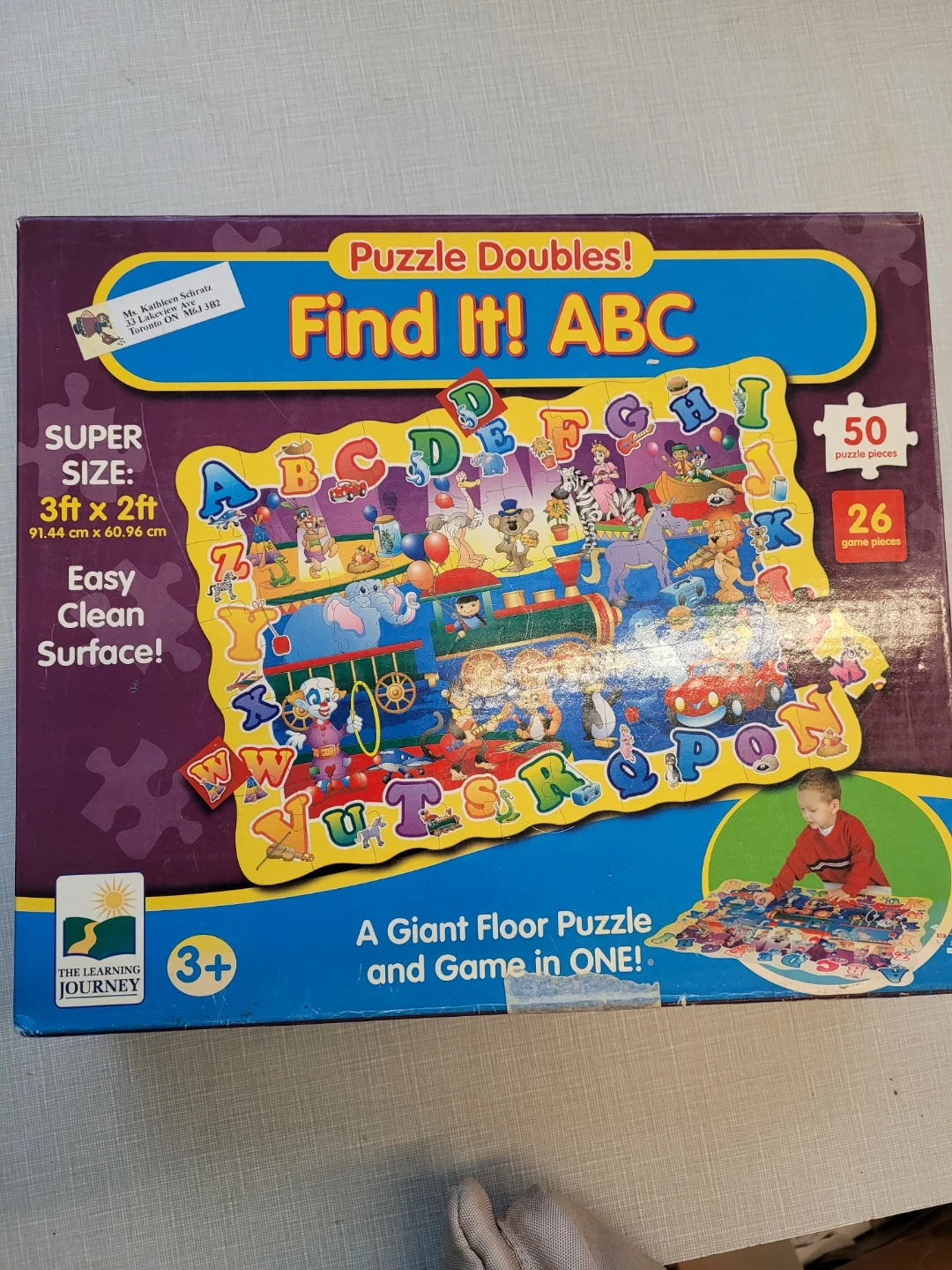 This is a giant floor puzzle and game in one! It's called Puzzle Doubles! Find It! ABC by The Learning Journey. The puzzle is 3ft x 2ft (91.44 cm x 60.96 cm). Suitable for children aged 36 months and up! Has 50 puzzle pieces and 26 game pieces