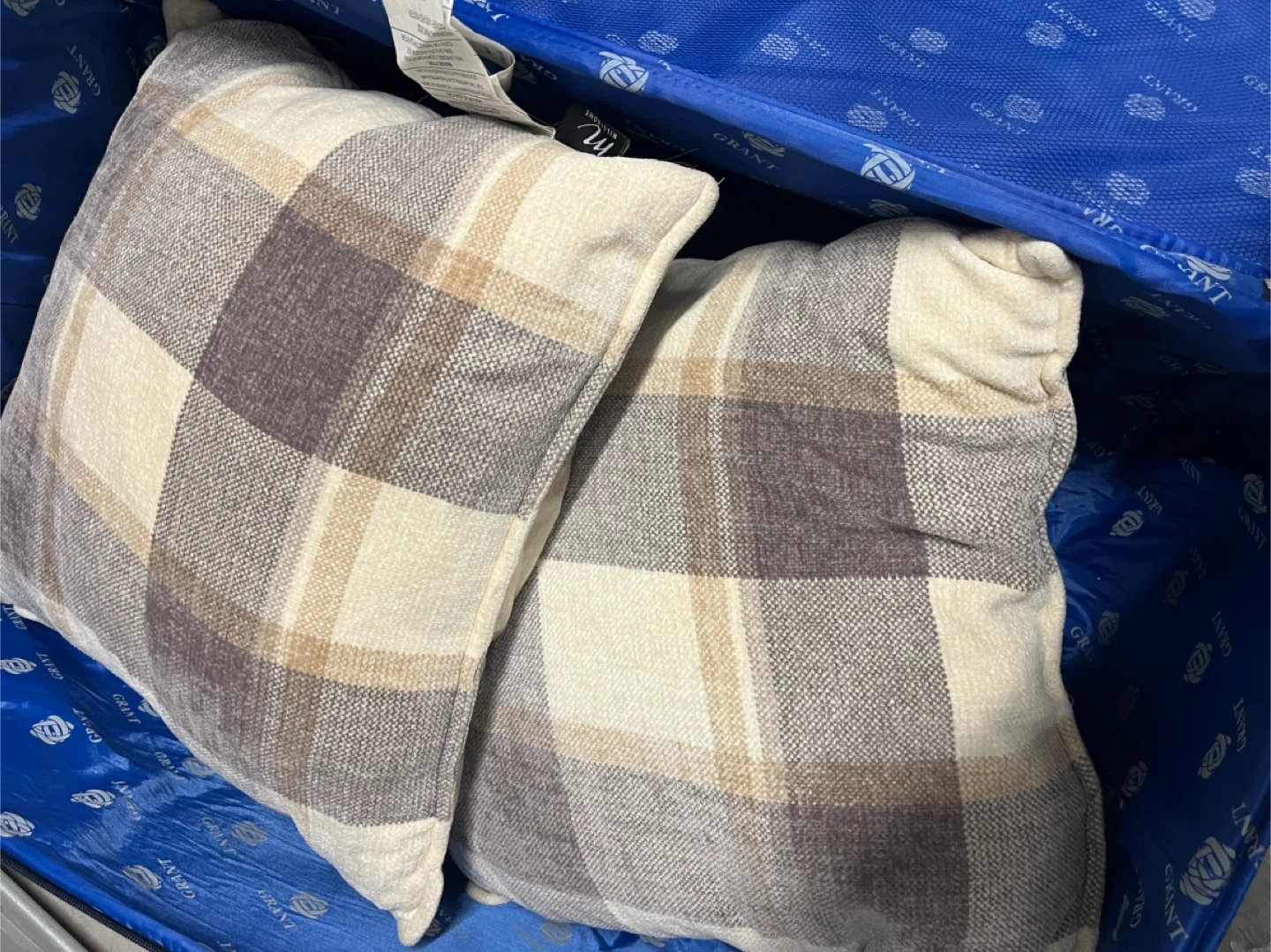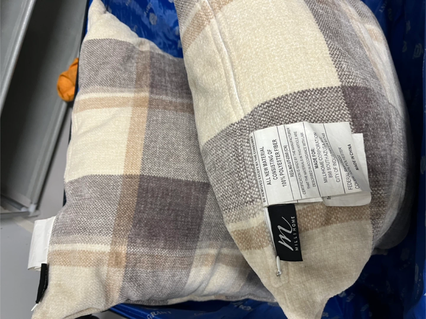 Two Millihome throw pillows with a plaid pattern. Shell and filling are 100% polyester fiber. Adds a cozy touch to any room!