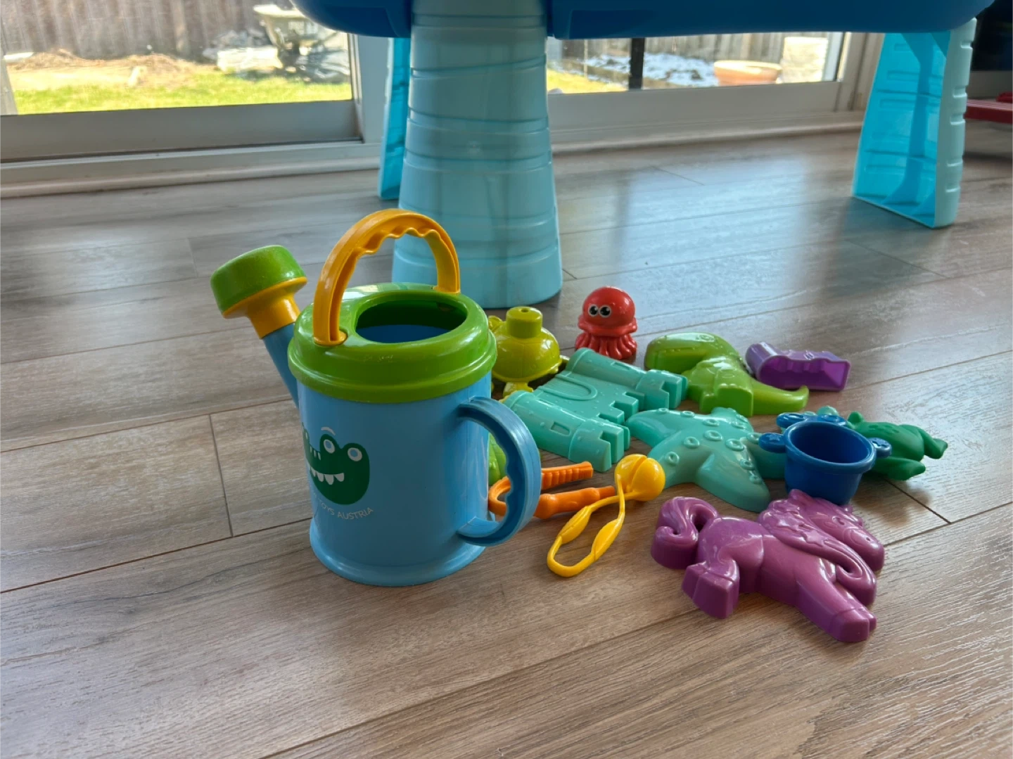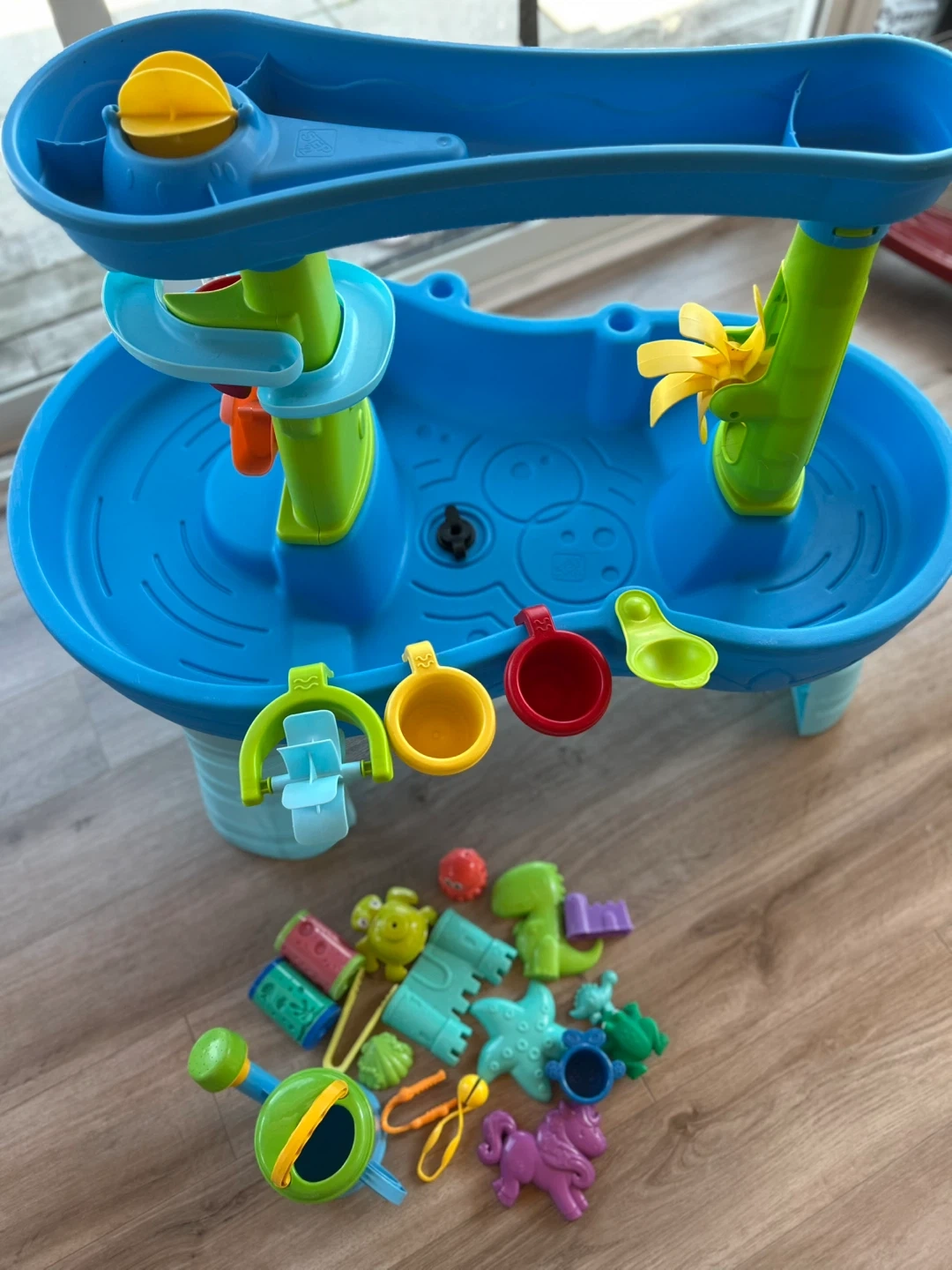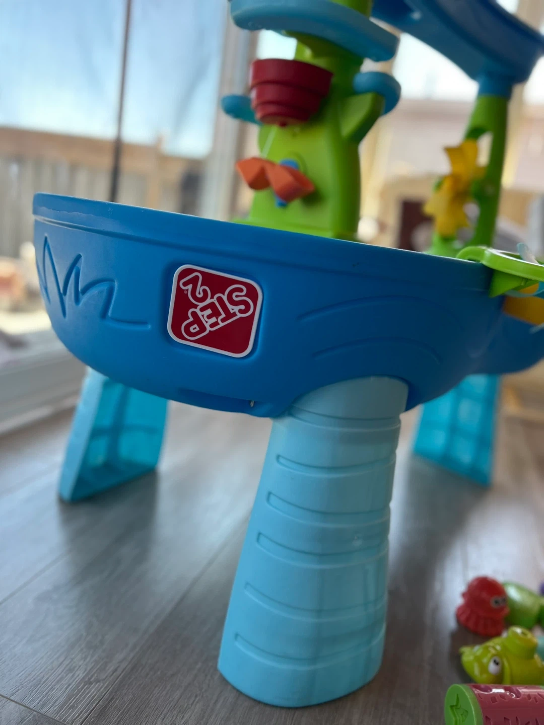 Fun Step2 water table for hours of outdoor play! It's made of durable plastic. This table's great for little ones on a warm day!