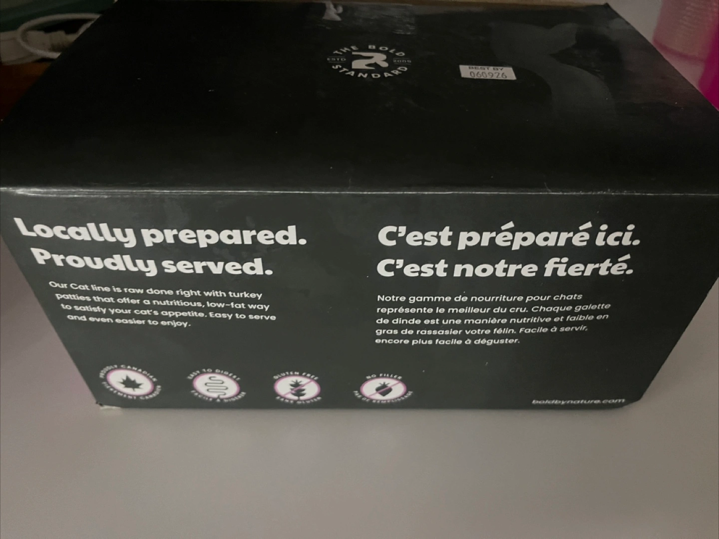 Selling a box of Bold by Nature cat food patties! These are turkey flavour, and come in a box that's been locally prepared. The best before date is 2026 September 26