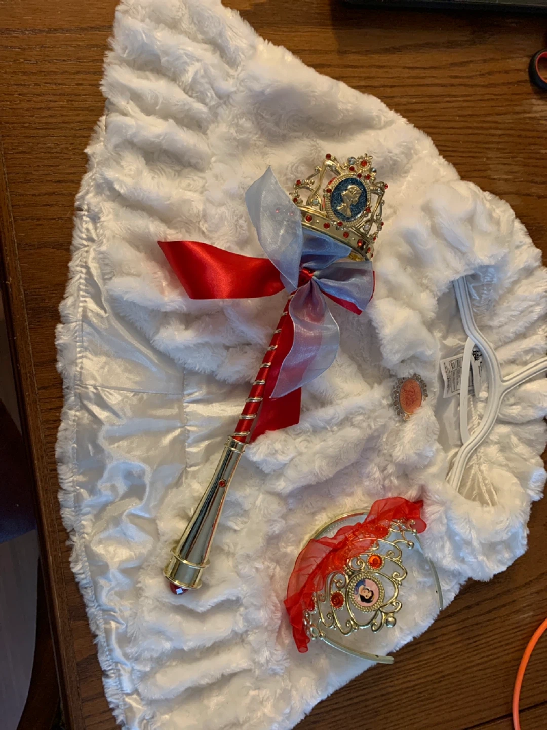 This lovely princess costume set includes a fluffy white cape, a sparkly tiara, and a decorative wand. The accessories are adorned with red and blue ribbons and a picture of a character's profile. It's perfect for dress-up play!