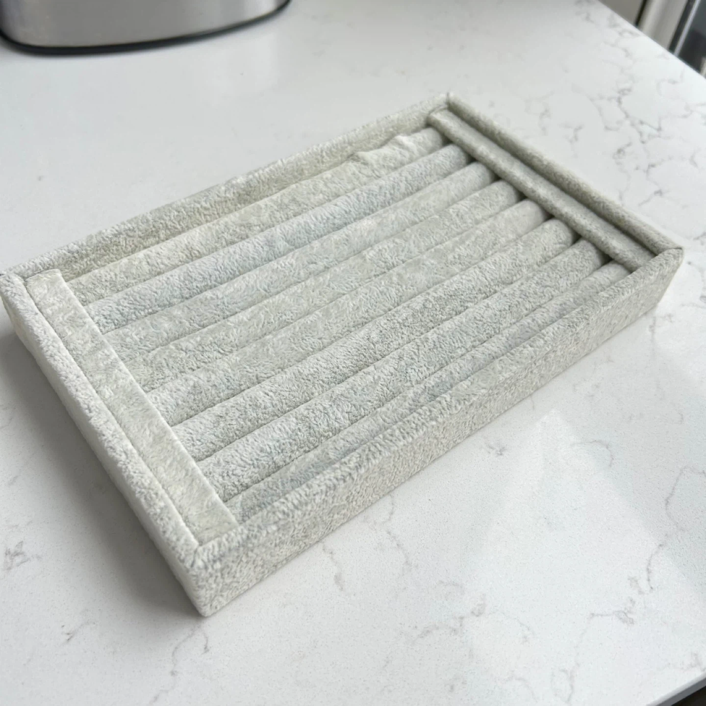 Grey velvet organizer tray for rings. It has multiple slots for keeping your rings neat. This tray is made of flocked material. Useful for displaying or storing jewellery!