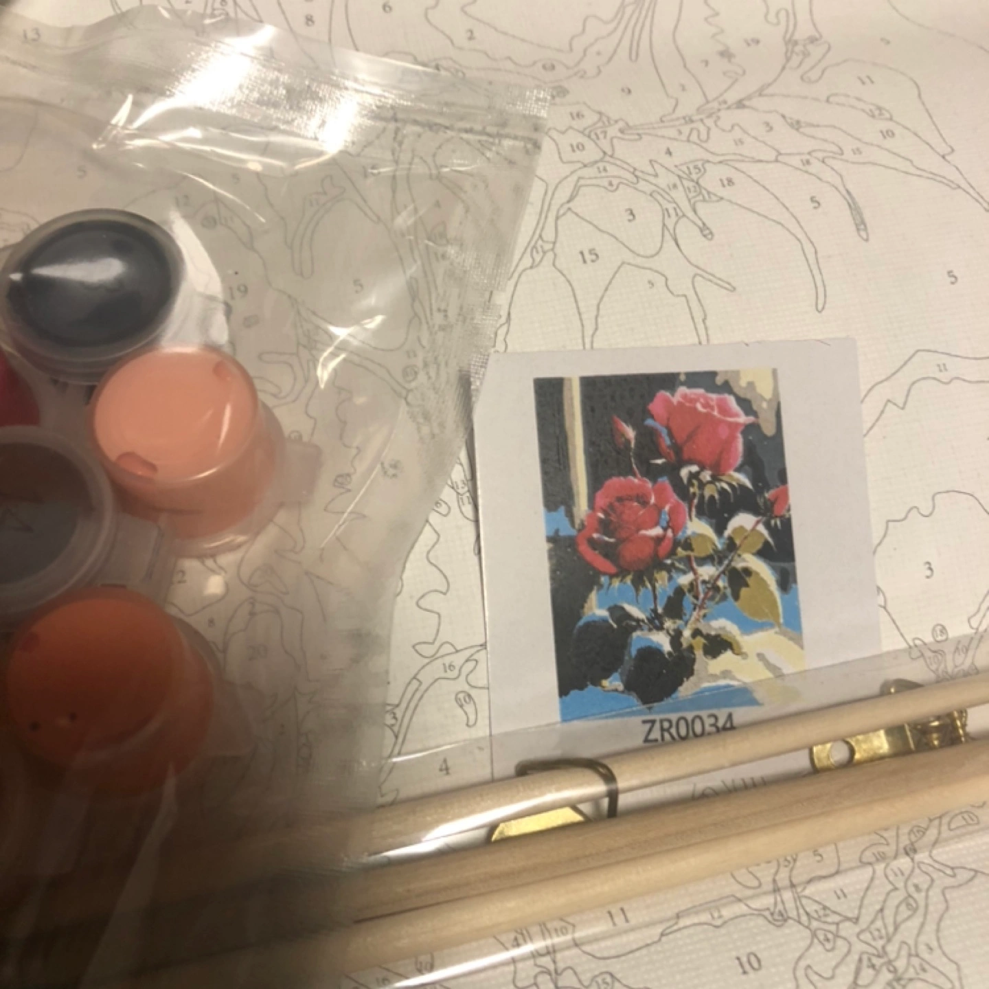 New paint by numbers kit. Includes canvas, acrylic paints, brushes, and instructions. Rose painting design. Perfect for beginners or experienced artists.