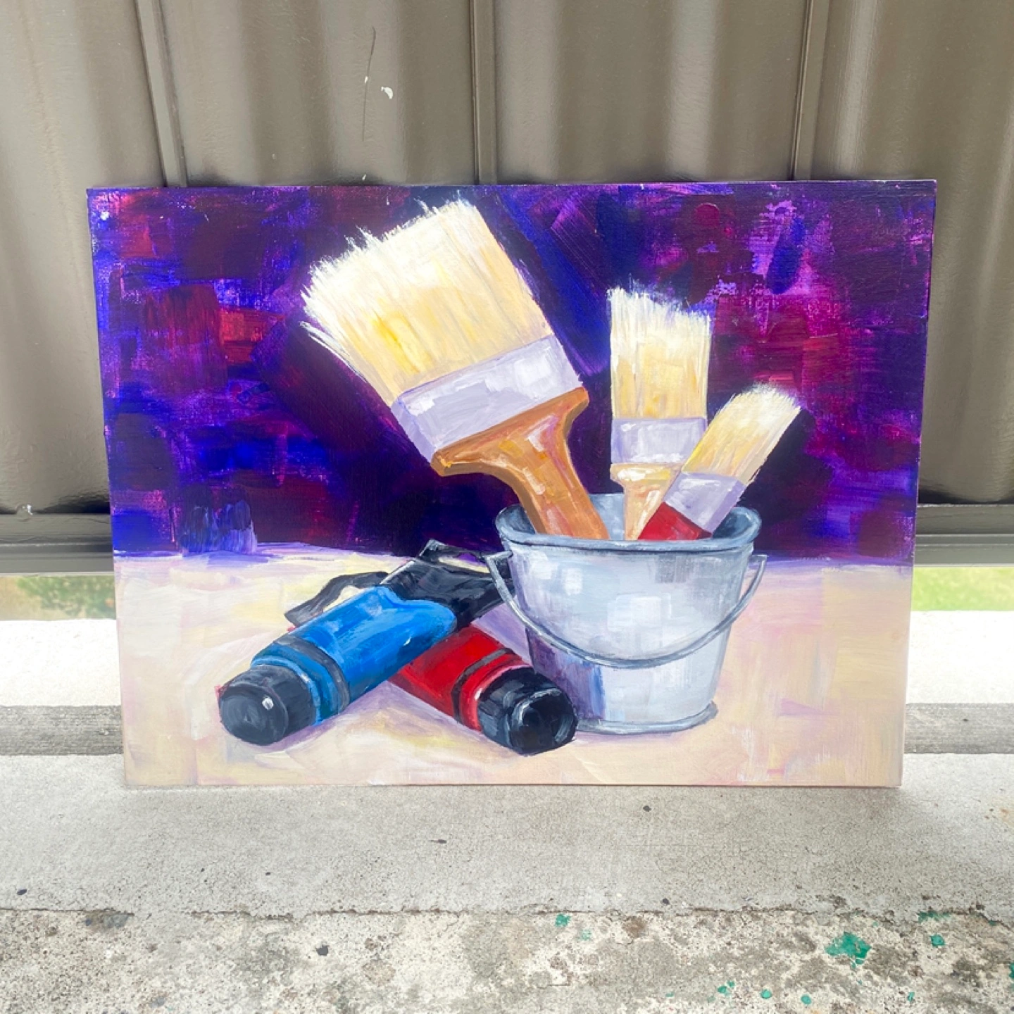 6512 x 16 inches. Acrylic painting on canvas. Hand painted artwork, features three paint brushes in a tin bucket, two tubes of paint one red and the other blue.