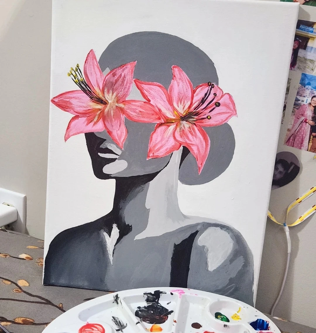 10A unique painting of a woman with pink flowers covering her eyes. The painting is done in shades of grey and pink. It would be a great addition to any art collection or a lovely piece to decorate your home