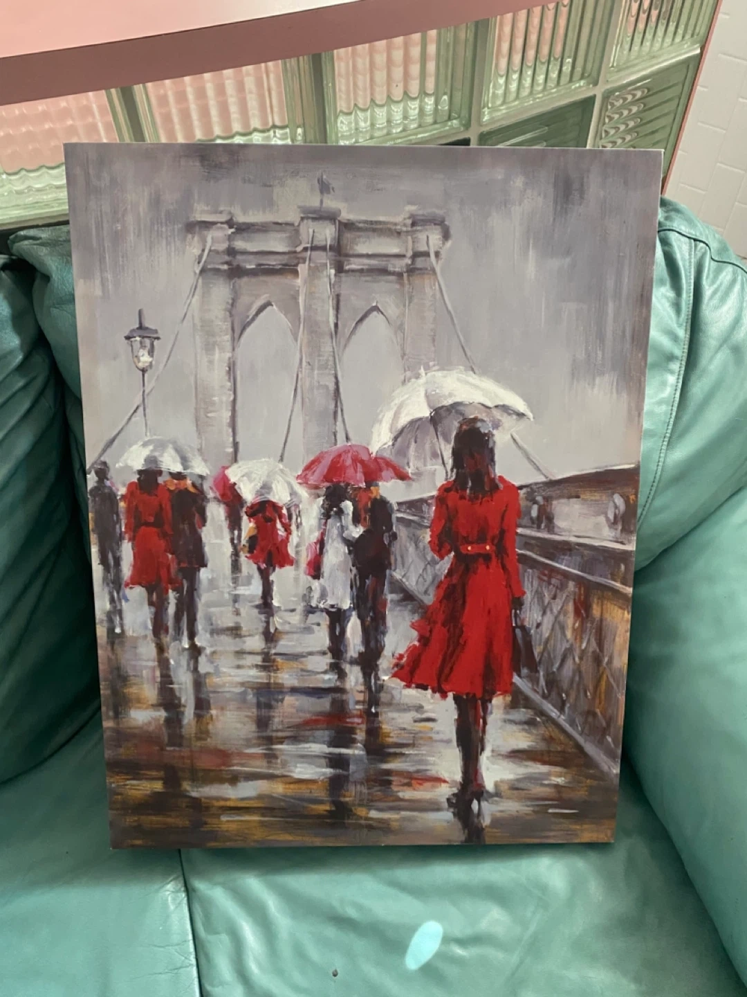 A lovely painting depicting the Brooklyn Bridge on a rainy day. The artwork features people with umbrellas, adding a touch of life and colour to the scene