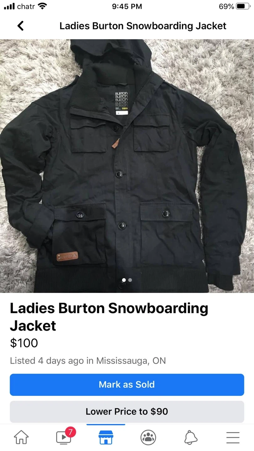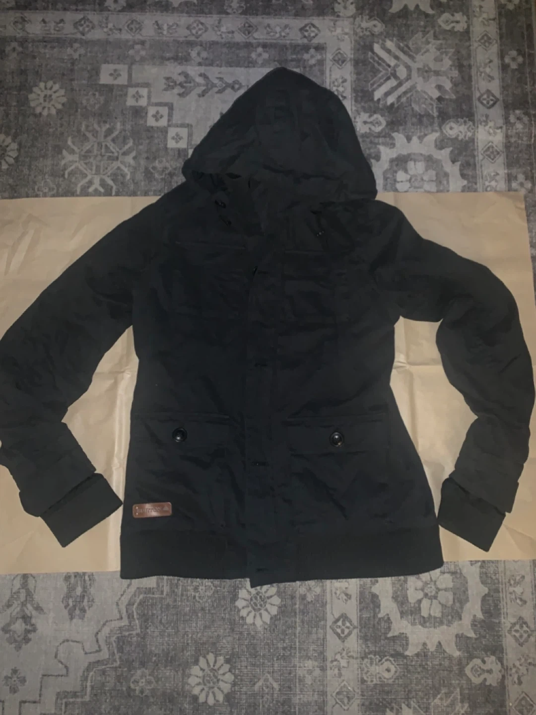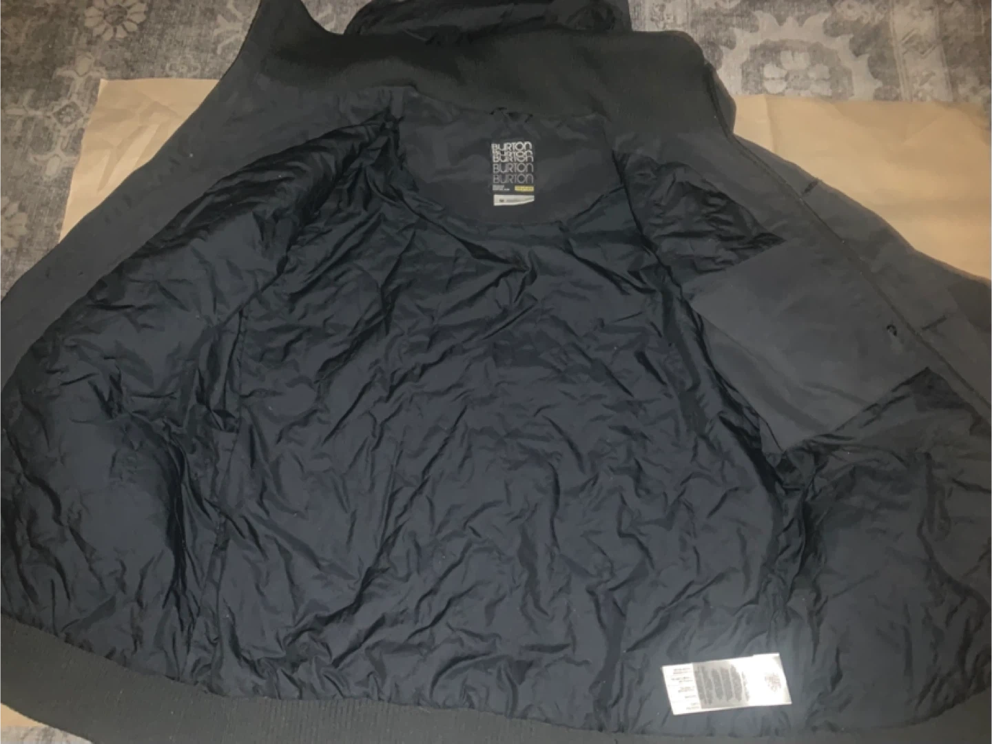 This is a black Burton snowboarding jacket for ladies. It's insulated and has a hood. Features multiple pockets and button closures. Missing one button on shoulder as seen in picture doesn’t affect the jacket.