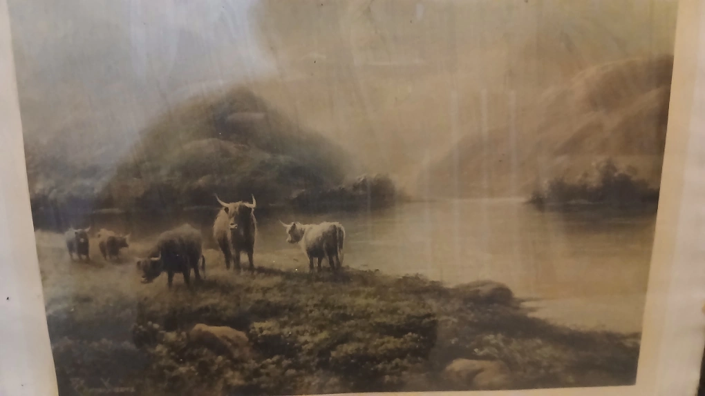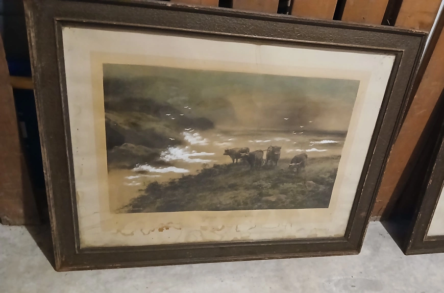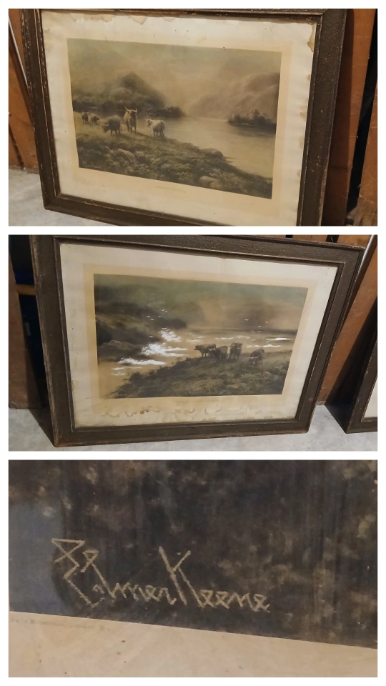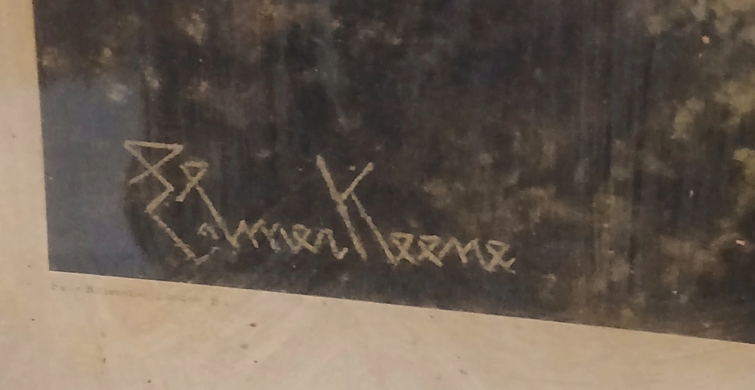 45Vintage framed print signed by Elmer Keene. The frame shows wear and tear, but the print itself is in good condition. A lovely piece for any art collector!