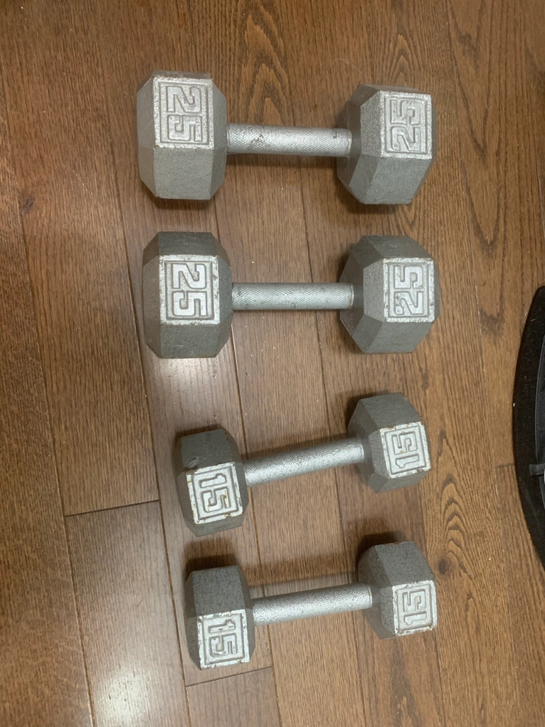 10Selling a set of dumbbells! There's a pair of 25lb weights and a pair of 15lb weights. Great for home workouts!