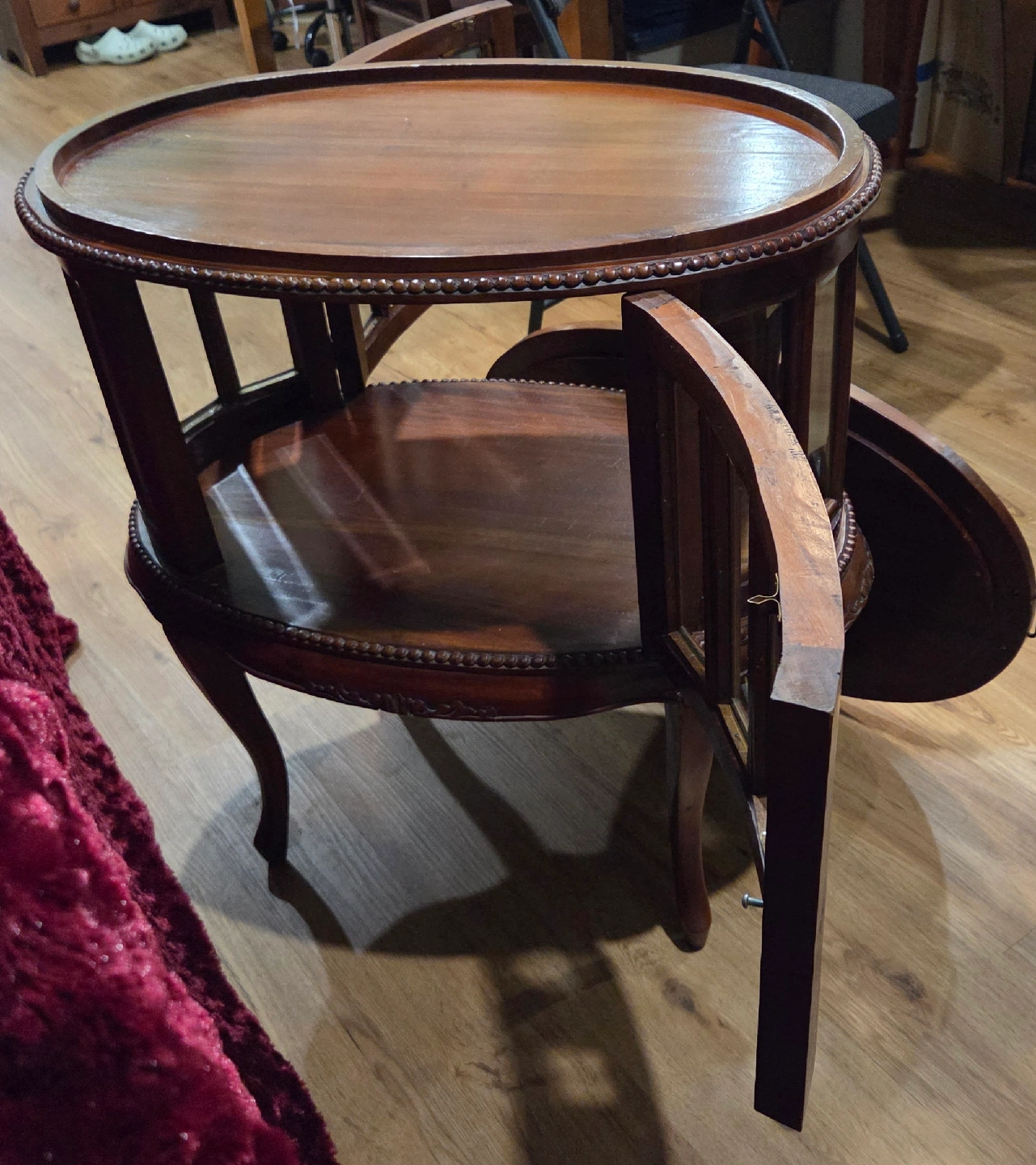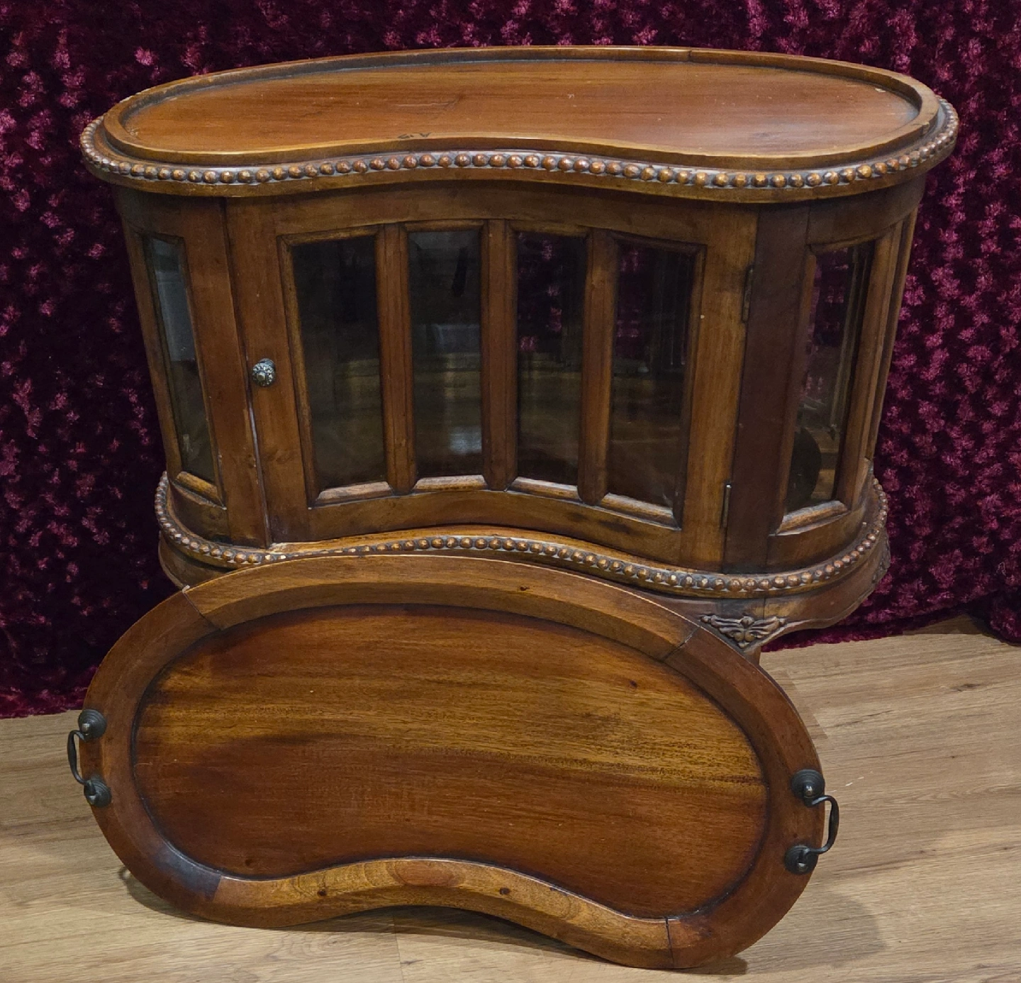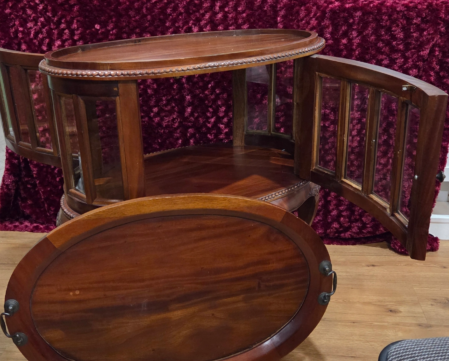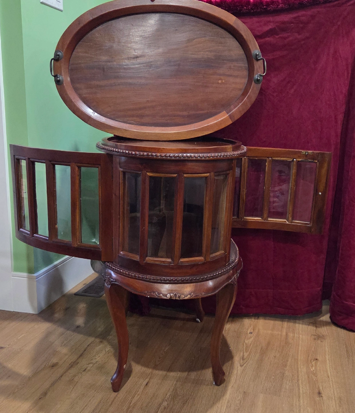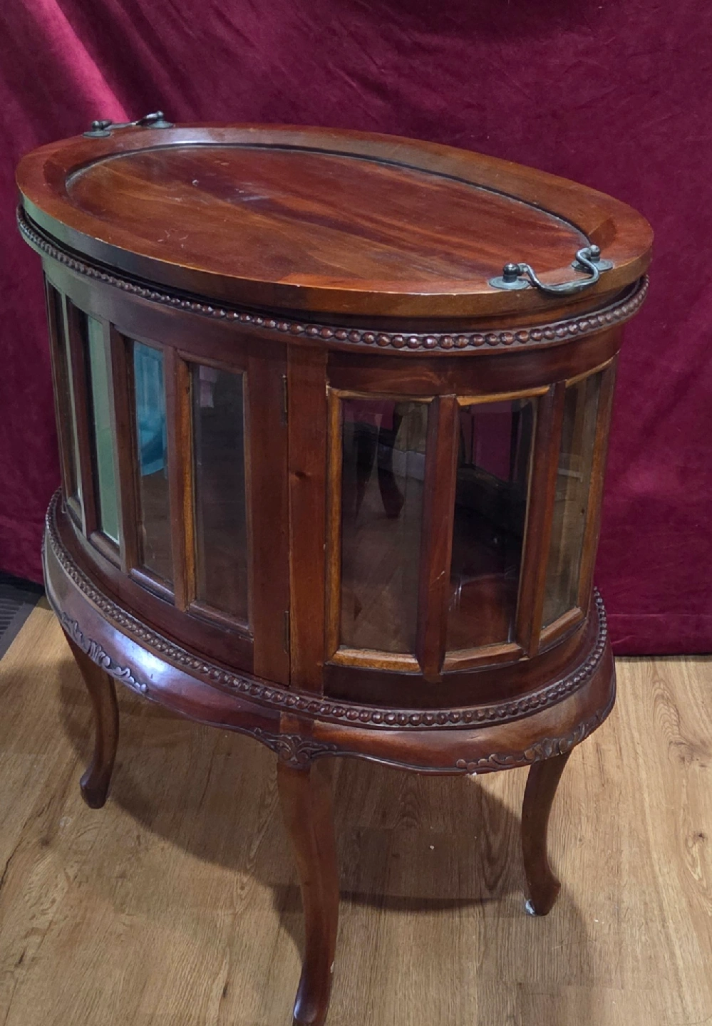Selling 2 charming vintage/antique display/liquor cabinets! Features: real wood frame with beveled glass panels, a removable tray on top, hinged doors ( one has 2 doors), many intricate, carved embellishments add to their beauty. Price is for the pair. call or msg Jay 519 790 9094