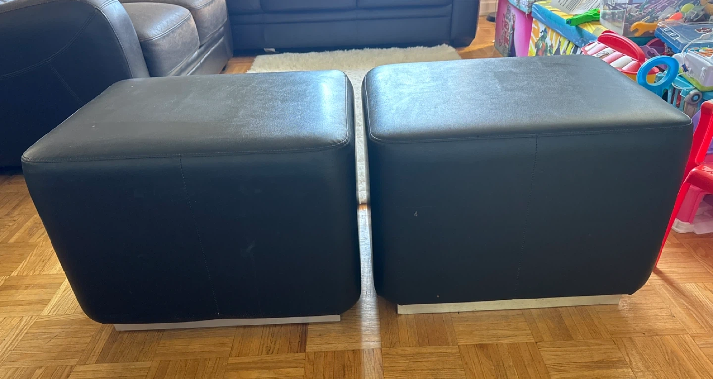 Selling a pair of stylish black cube ottomans. They're in good condition and would look great in any living room or den. These are perfect for extra seating or just to put your feet up after a long day!