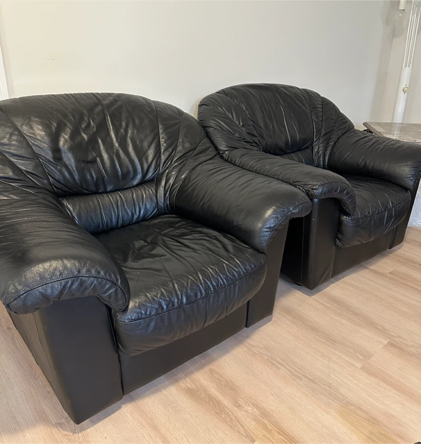 Selling a pair of comfy black leather armchairs. They're in great shape and would look great in any living room or den. Perfect for relaxing after a long day!