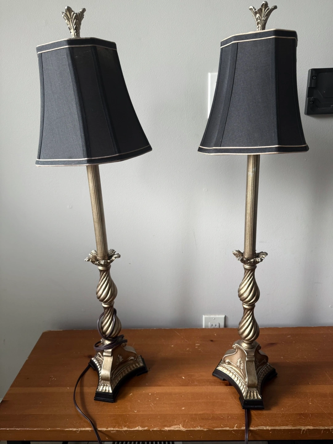 Selling a pair of table lamps with black shades. They have a decorative, ornate base. Perfect for adding a touch of elegance to any room!