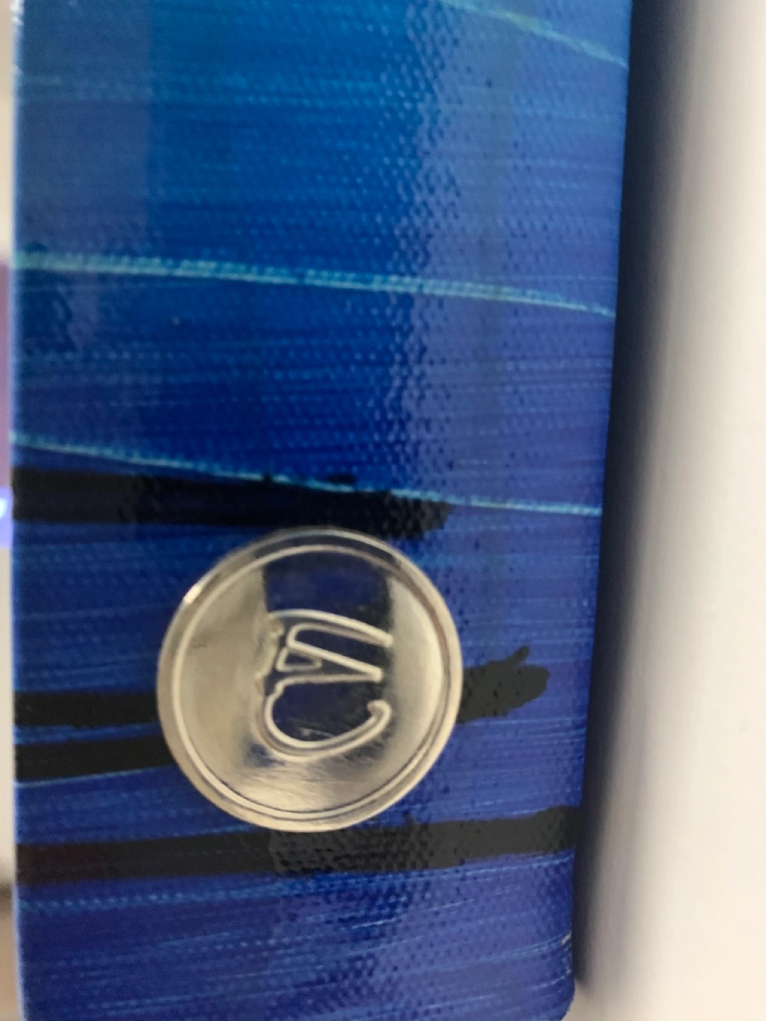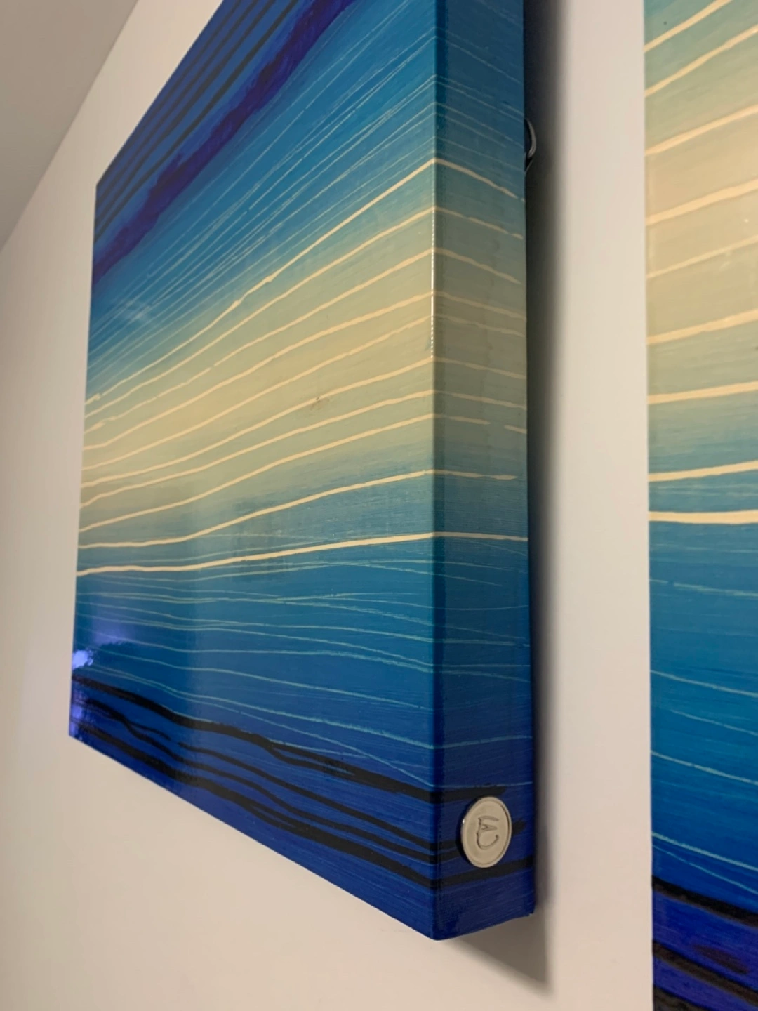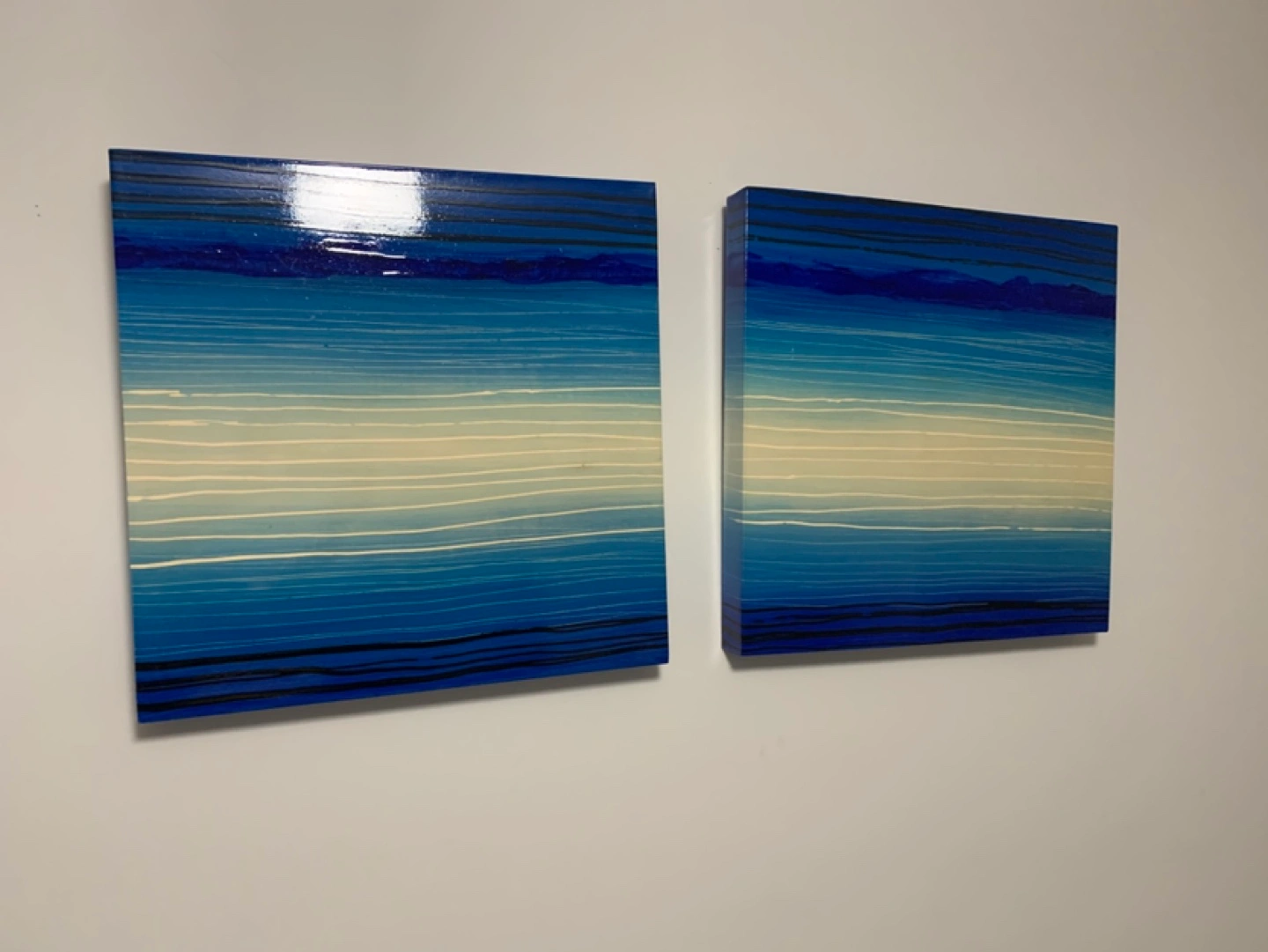 Set of two matching blue abstract paintings. Horizontal stripes, various shades of blue and cream. Gallery wrapped canvas. Ready to hang.