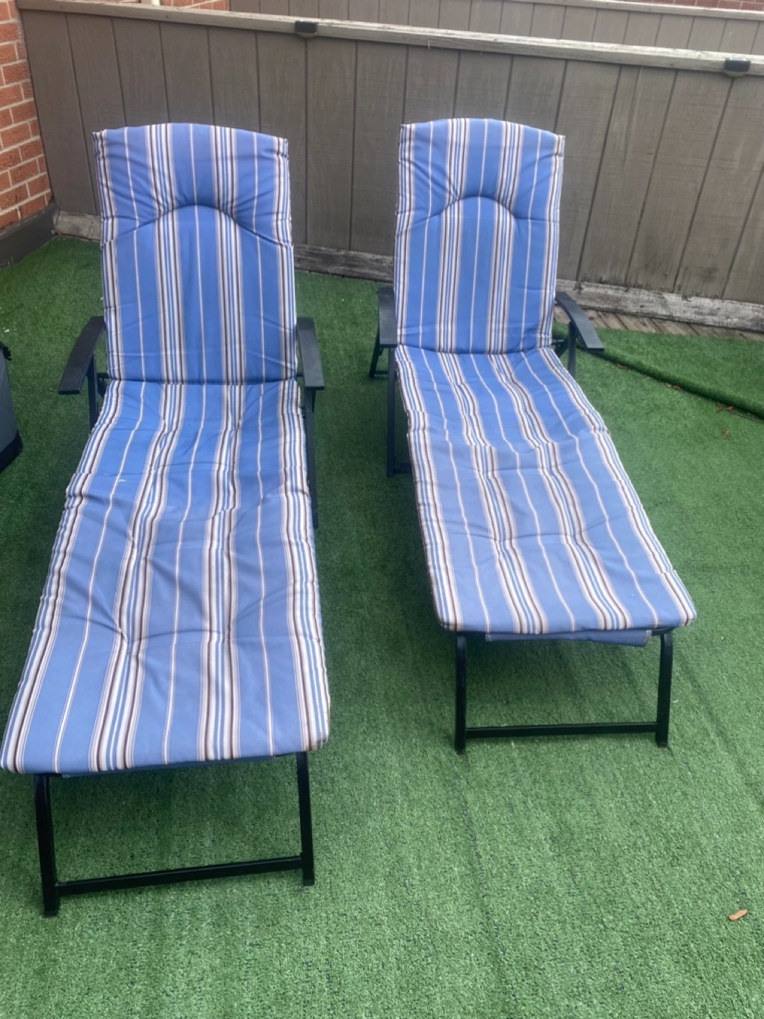 Selling a pair of lounge chairs with a blue and white striped pattern. They are in good condition and perfect for relaxing outdoors! Some rust spots but work great and fold down for easy storage
