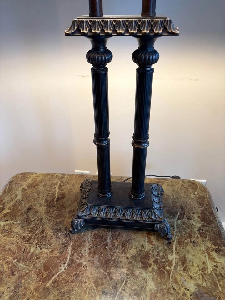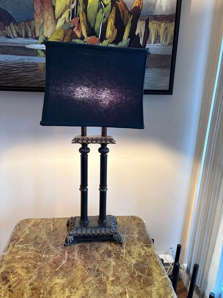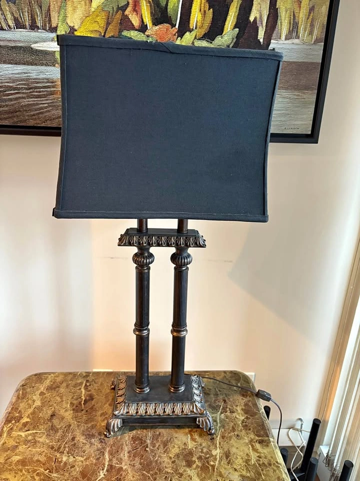 Elegant matching pair of traditional table lamps. Dark bronze finish with twin fluted columns, acanthus detailing, and rectangular black fabric shades—great for living room end tables, console, or bedroom. Pickup: White Rock