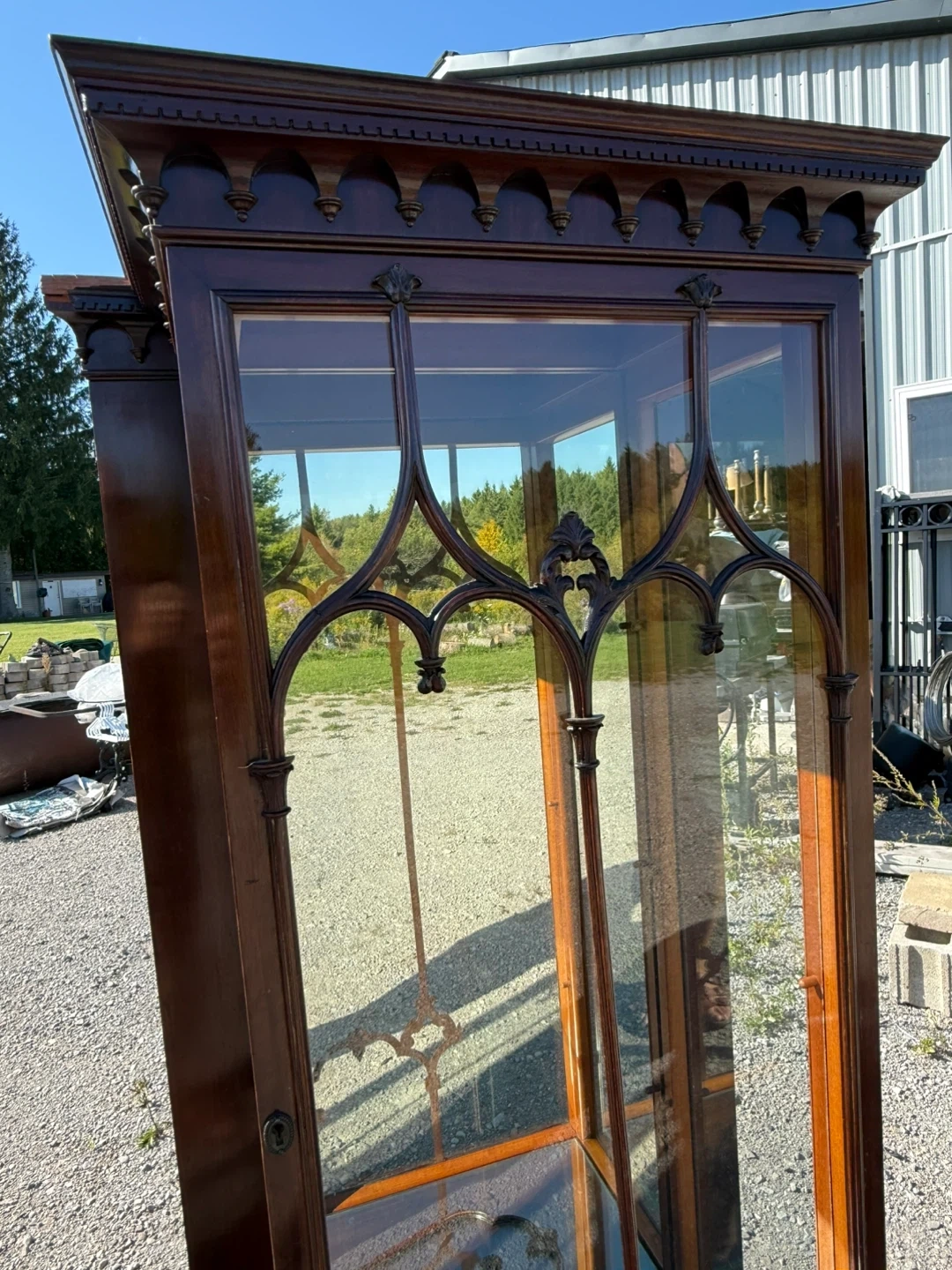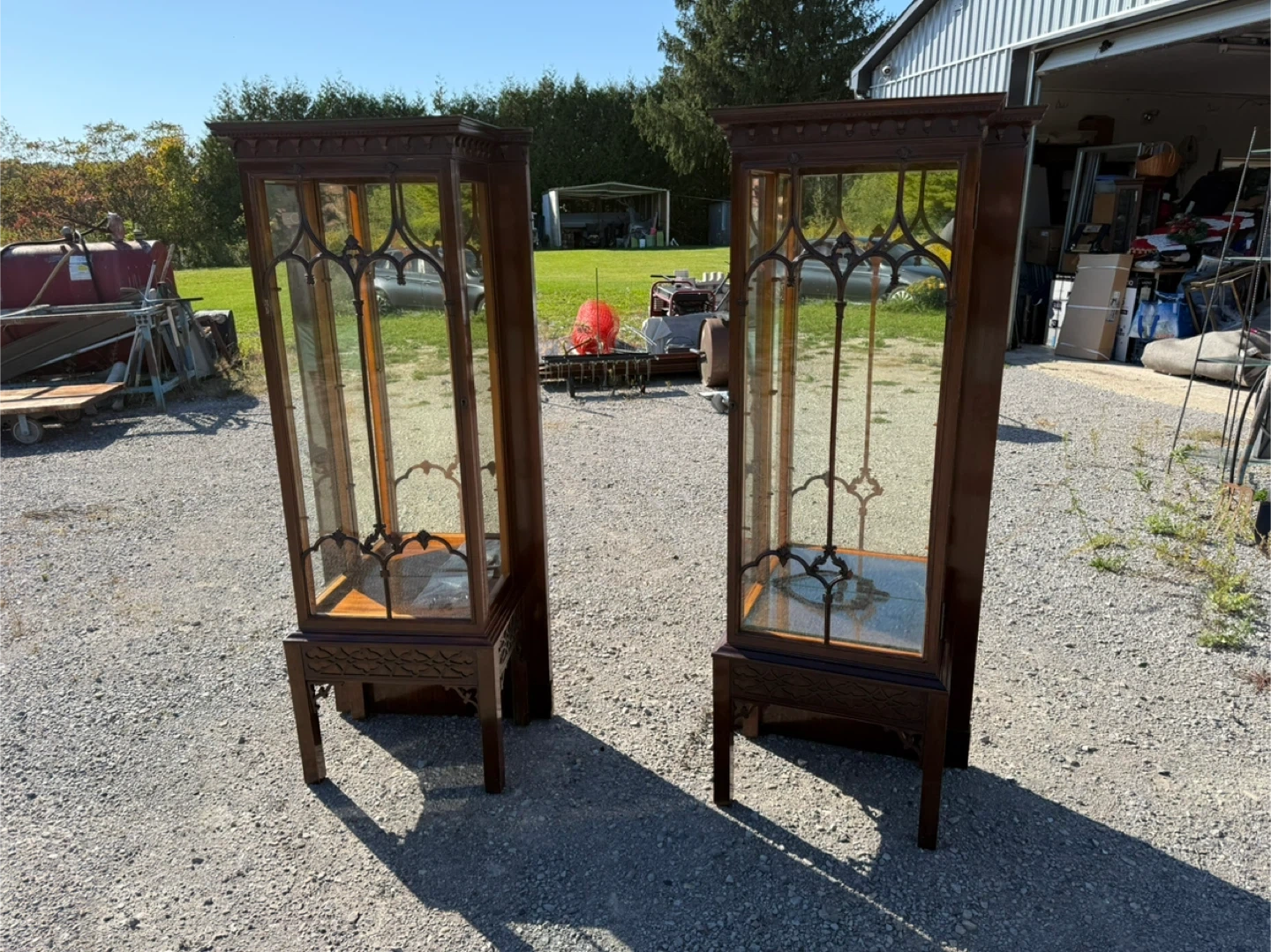 Selling a pair of antique display cabinets. They are made of dark wood and feature glass panels on the front and sides. They have a unique design on the front glass. Perfect for displaying collectibles or other items. These originally flanked a built in…