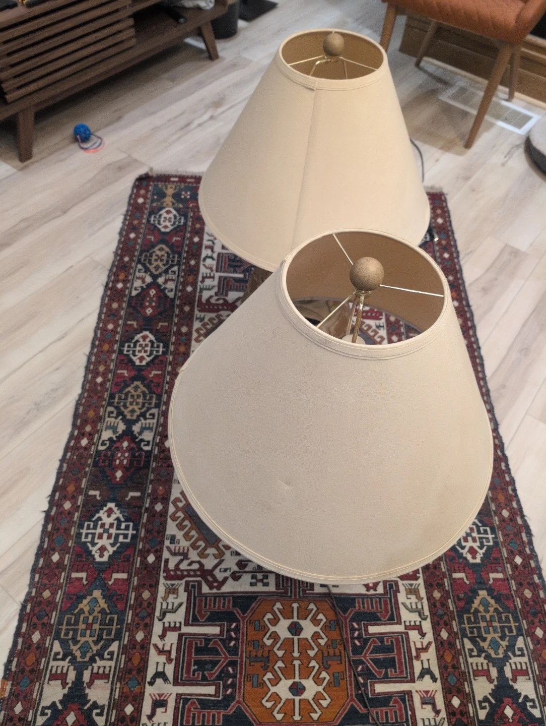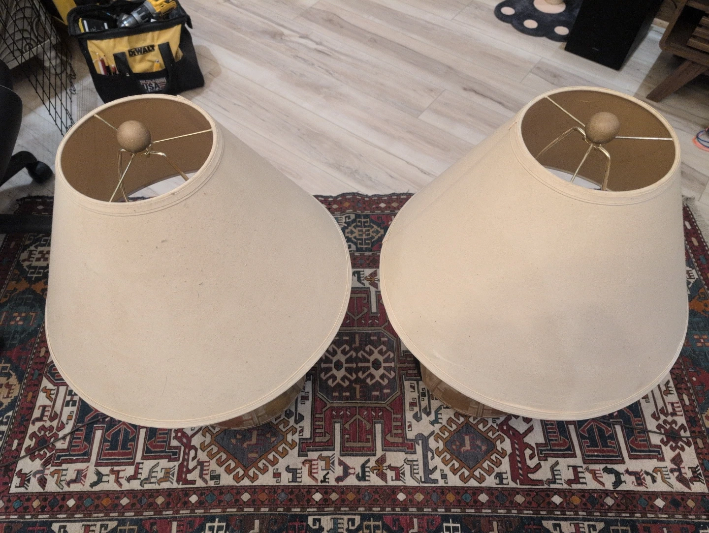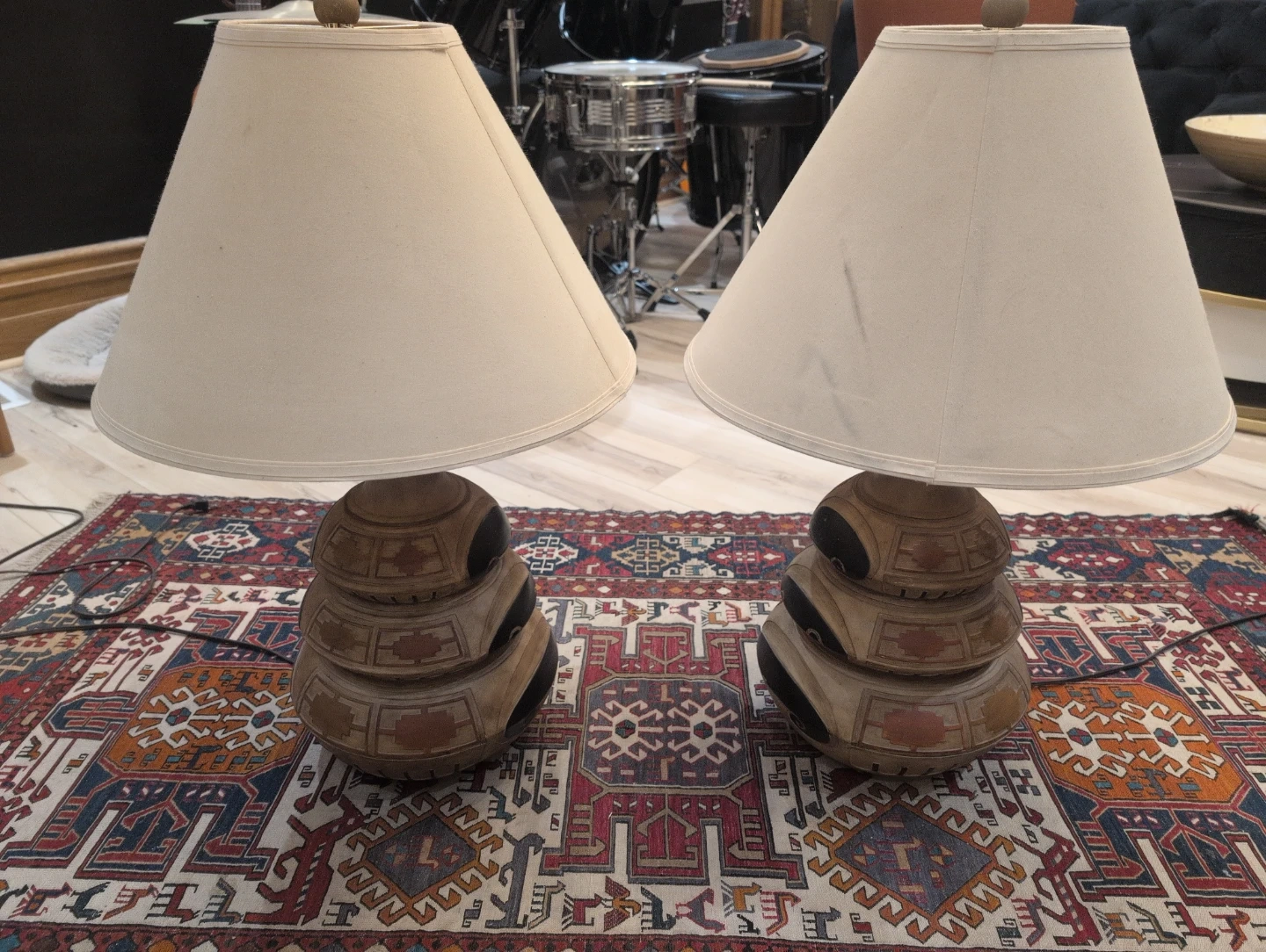 70Selling a pair of decorative table lamps. They have a unique design and would look great in any room. The lamps are in good condition and come with the shades.